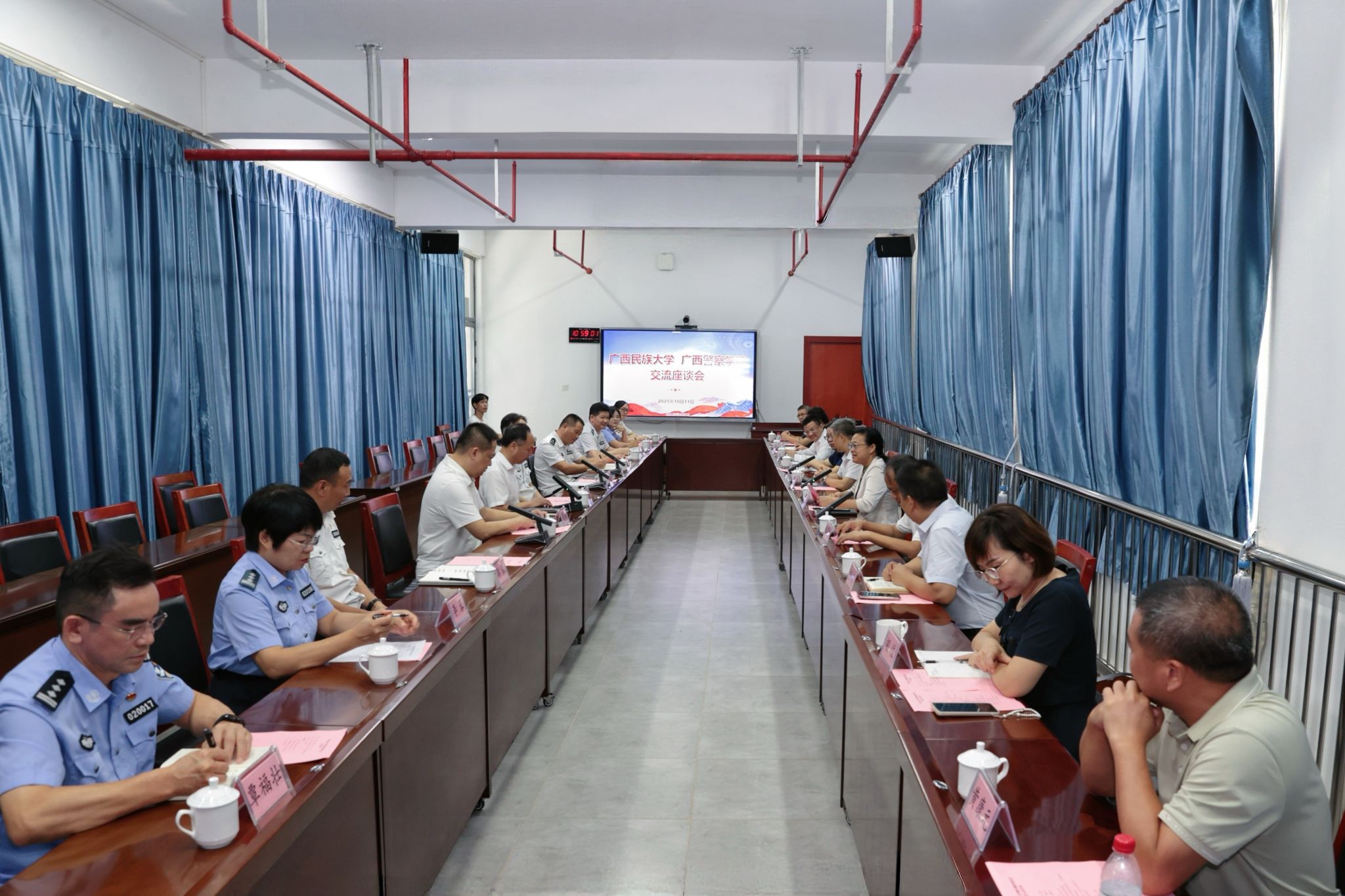 何立荣对韦仕珍一行的到访表示热烈欢迎。他表示,广西民族大学在人文社会科学、民族研究等领域积淀深厚,广西警察学院在治安管理、法治建设和实战应用能力培养等方面优势突出,双方在学科特色与资源禀赋上高度互补。他希望双方以此次交流为契机,共同探索国家安全学联合建设的有效路径,携手提升学科建设质量与人才培养层次,切实推动两校内涵式高质量发展,为服务区域经济社会高质量发展、助力新时代壮美广西建设贡献智慧与力量。