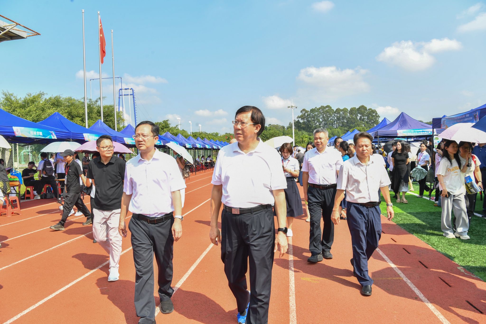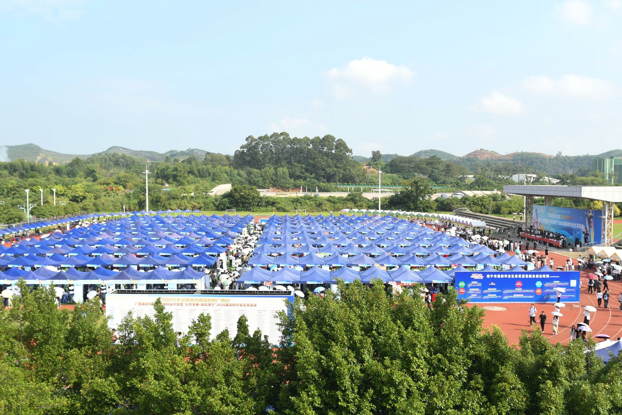 【大学生通讯社报道】10月11日上午,2025年全国城市巡回招聘广西站——广西高校毕业生留桂就业计划暨“火热青春·就在南宁”2026届高校毕业生双选会在广西民族大学思源湖校区李宁田径场举办。自治区人力资源和社会保障厅党组成员、副厅长韦杰,广西民族大学党委书记唐平秋、党委副书记陈铭彬,自治区国资委二级巡视员何载福等领导到场调研指导。
