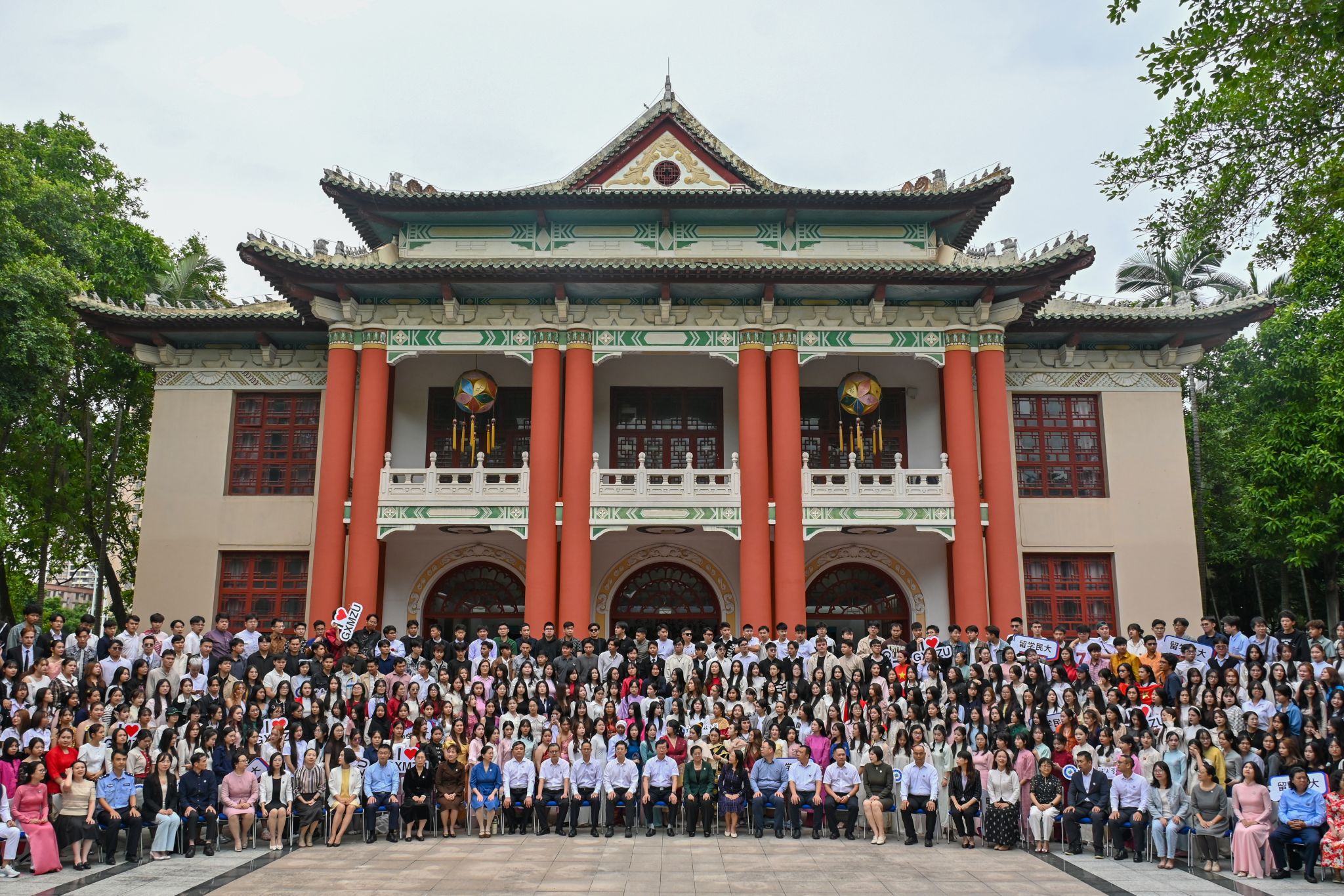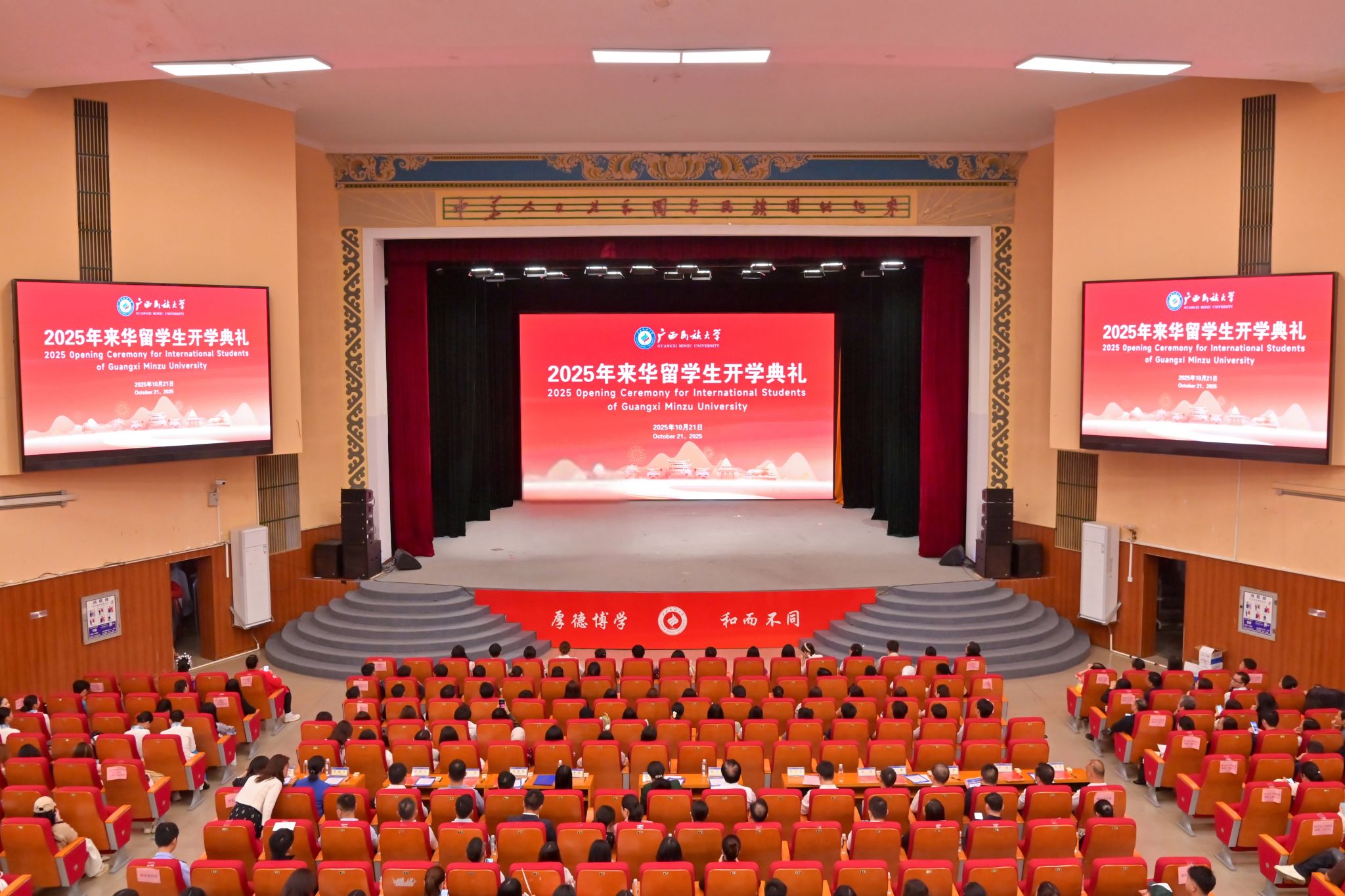 【大学生通讯社报道】10月21日下午,广西民族大学2025年来华留学生开学典礼在相思湖校区大礼堂举行。校党委书记唐平秋出席并为留学生代表颁发校徽,校长韦仕珍出席并讲话。副校长高兴宇主持典礼,学校有关职能部门及留学生培养学院负责人、2025级全体留学生参加典礼。