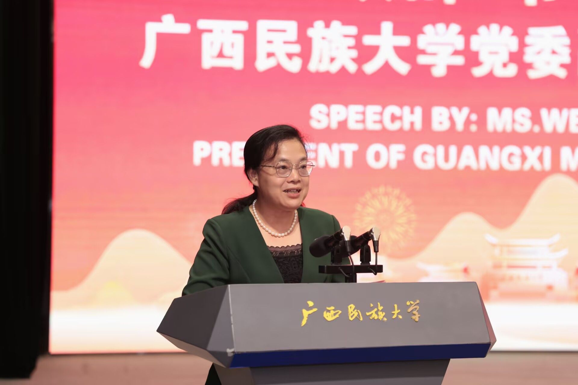 韦仕珍回顾学校国际化办学成就,围绕“厚德博学,和而不同”的校训向新生们提出希望:一是锐意进取、不断追求,以专业为基,筑牢成长根基,培养高尚道德情操;二是珍惜课堂时光,主动参与科研项目与实践活动,努力学习中国文化和专业知识,在“专业+国际视野”的培养模式中锤炼本领;三是既“读万卷书”又“行万里路”,积极参与学校组织的各类活动,体验中华优秀传统文化;四是严格遵守中国的法律法规,秉持相互尊重的心态,勇于应对因各种“不一样”带来的挑战,尽快融入中国新生活,与中国各民族同学、世界各国同学和睦相处,共同生活、学习、进步;五是做文明交流互鉴的传播者、推动者和“知华友华”的使者,为构建人类命运共同体贡献青春力量。