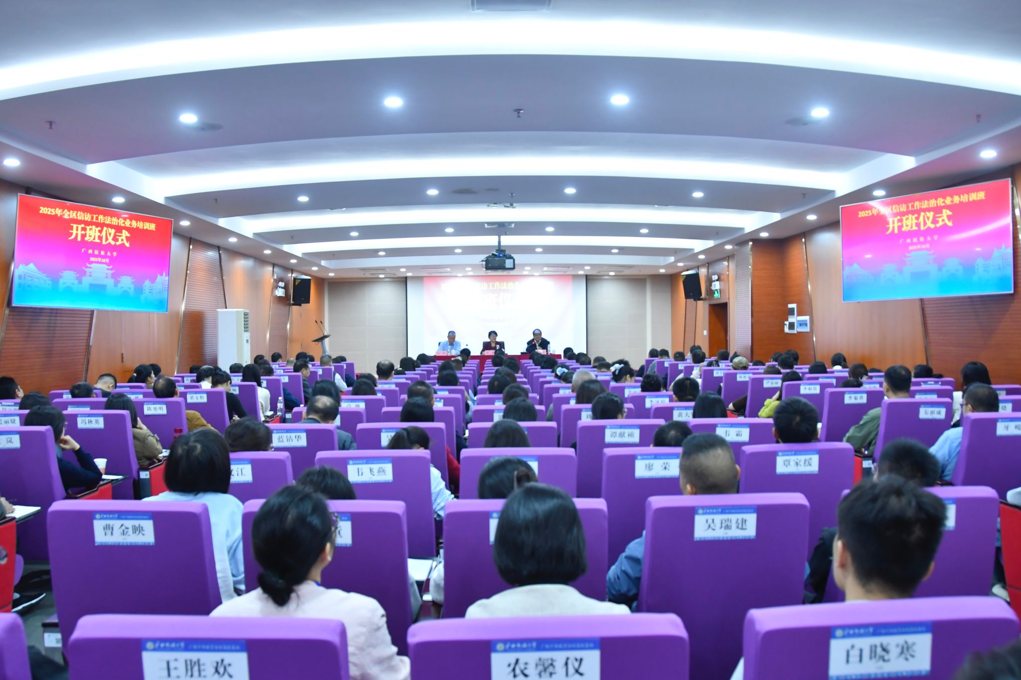 10月27日,校党委常委、副校长蔡高根在2025年全区信访工作法治化业务培训班开班仪式上表示,学校高度重视此次培训保障工作,统筹做好后勤服务,全力支持培训顺利开展,希望培训期间学员们弘扬“石榴籽精神”,互帮互助、团结友爱,共同提升学习成效。(初审/卢扬奎 图文/农可盈 编/梁晶晶 复审/韦利坤 终审/孙寿媚)