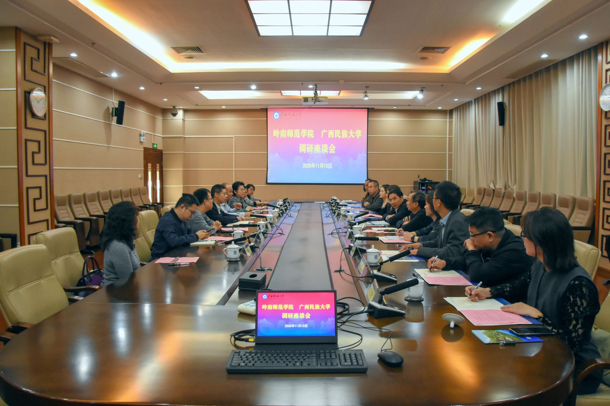 11月13日,校党委副书记邓国彬会见岭南师范学院党委副书记林晓敏一行。双方分享学校发展历程及办学经验,就深化校际间人才培养、学科建设、统战工作等领域的合作内容展开交流。(初审/黄炤英 图/徐子强 文/卢思然 徐子强 编/韦丽娜 实习编辑:樊甲利 复审/韦利坤 终审/孙寿媚)