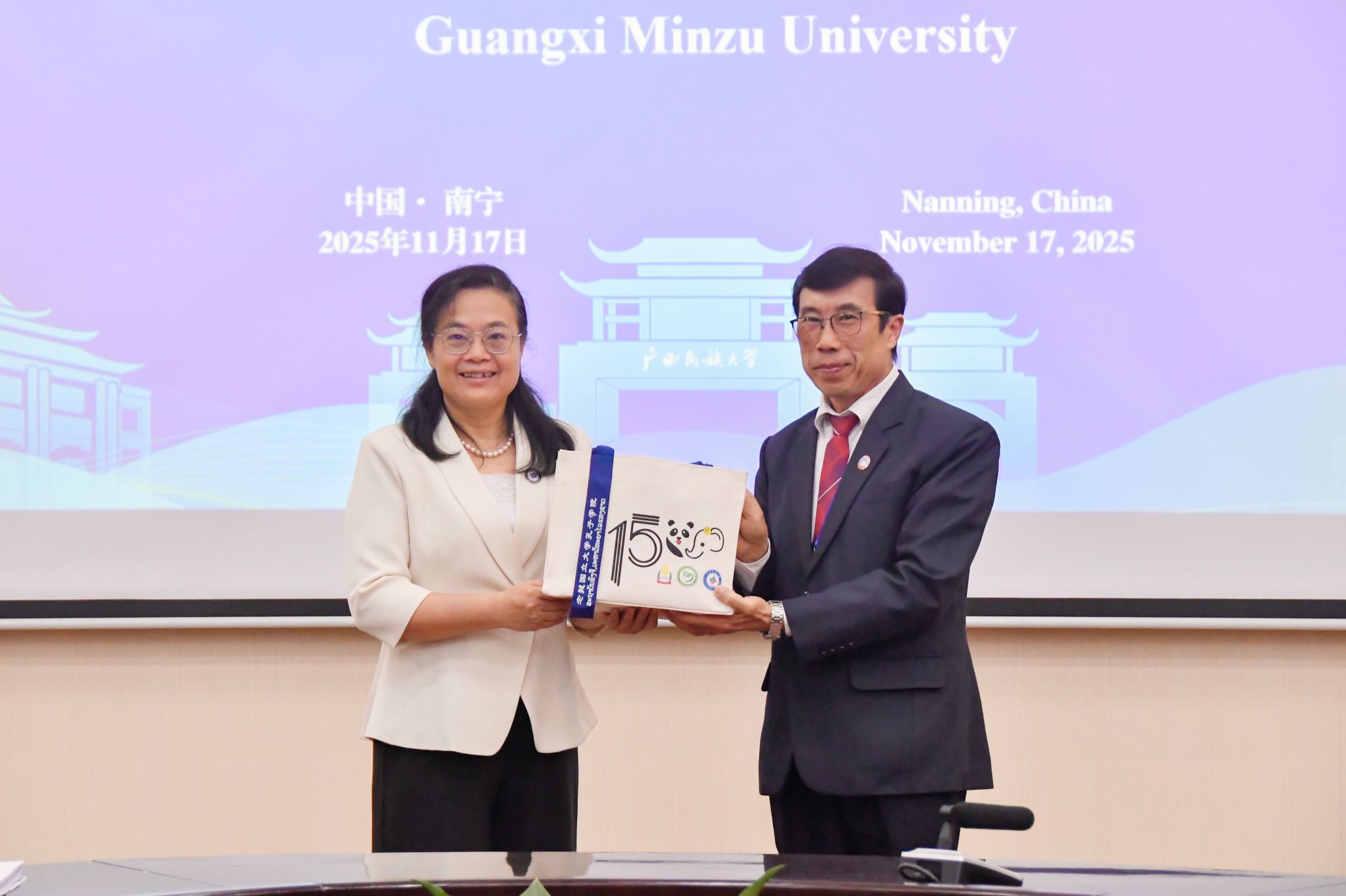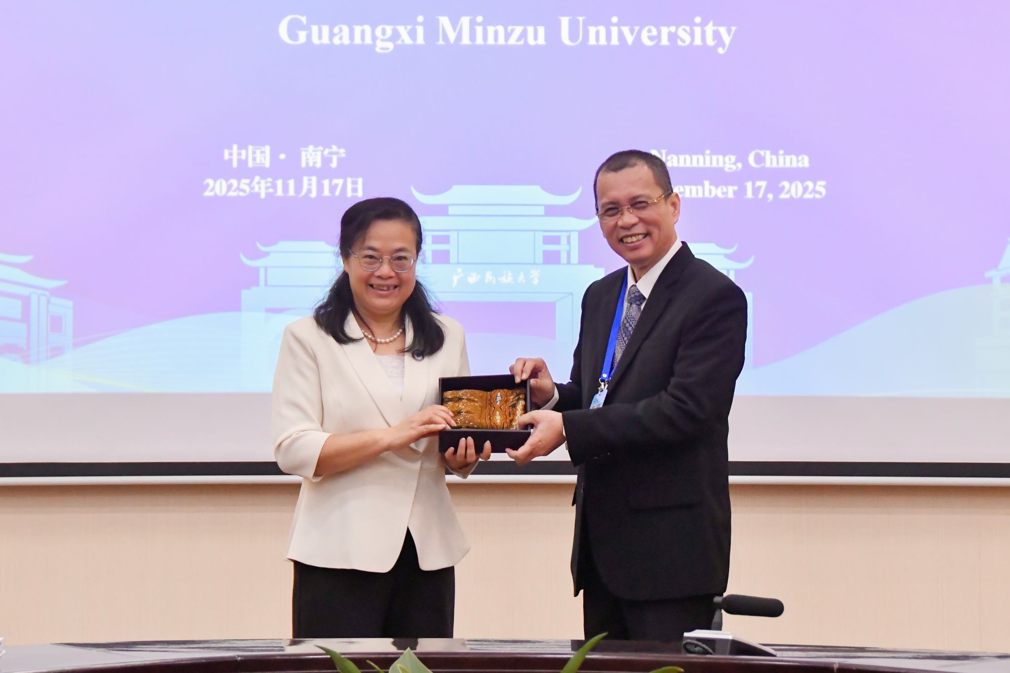 【大学生通讯社报道】11月17日上午,广西民族大学2025年度孔子学院理事会暨联席会在相思湖校区国际合作与交流处大会议室召开。校长韦仕珍出席并致辞,泰国玛哈沙拉坎大学校长巴育·希维莱、老挝国立大学校长德萨努拉·森登德、印度尼西亚丹戎布拉大学校长嘉鲁达·韦科出席会议,副校长姜明国主持会议,孔子学院中方、泰方、老方、印尼方代表、学校有关职能部门负责人与会。