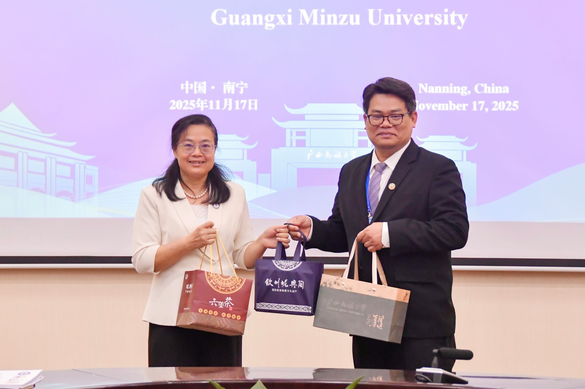 韦仕珍对与会来宾表示热烈欢迎。她表示,2025年孔子学院在四个方面取得显著成效,一是中文教学质量持续提升,办学规模不断扩大,积极推荐优秀学子来华深造;二是精准对接当地政府和企业需求,深入拓展“中文+职业”培训,创新合作方式与内容,培养各类本土化人才成果丰硕;三是深入开展文化交流活动,特色品牌效应凸显,有效促进中外文明互鉴;四是不断强化孔院品牌建设,宣传力度增大,提升社会影响力和认可度。她期待与各方继续深化合作,为中泰、中老、中印尼友好事业培育更多优秀人才,续写合作新篇章。