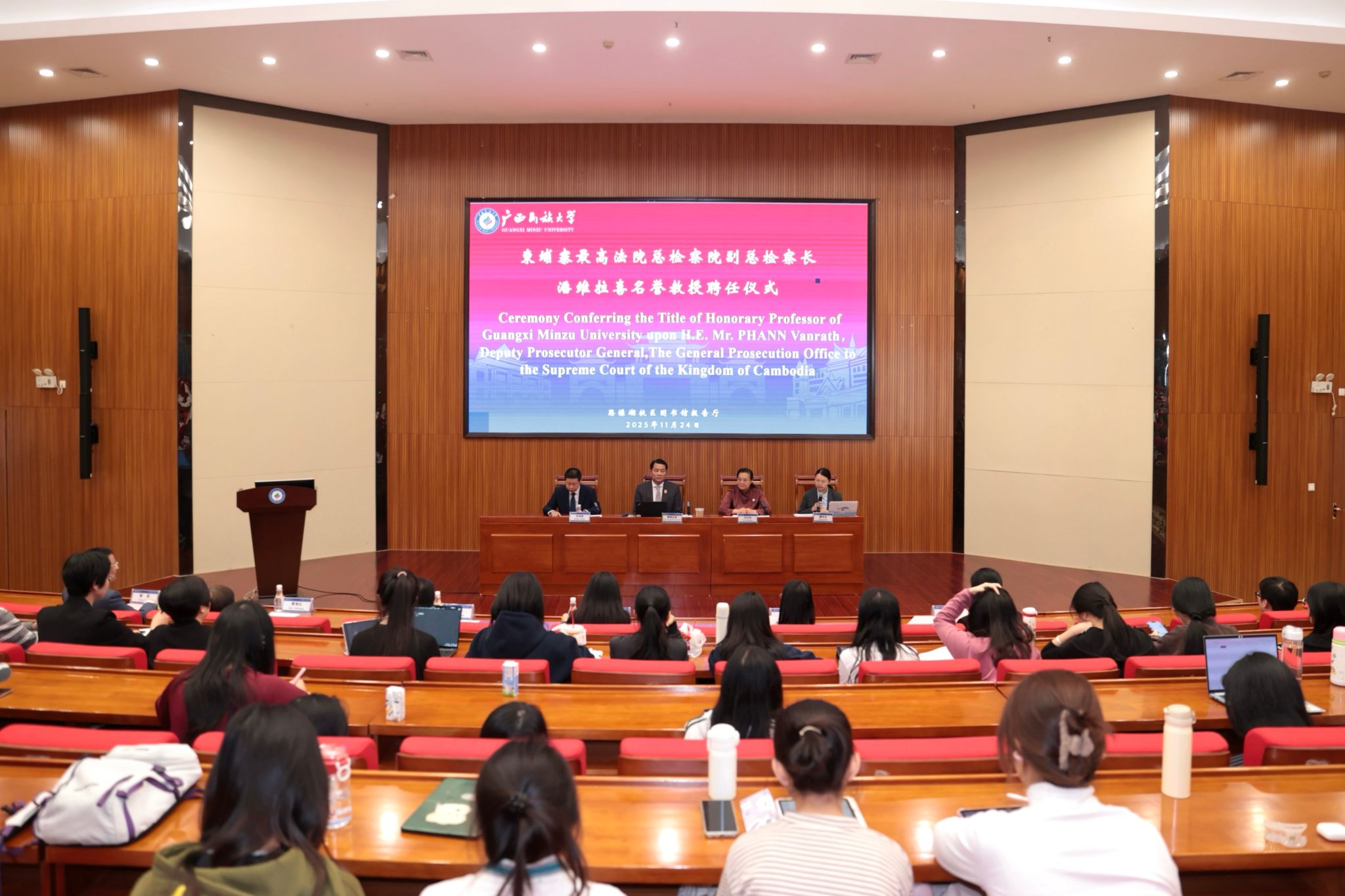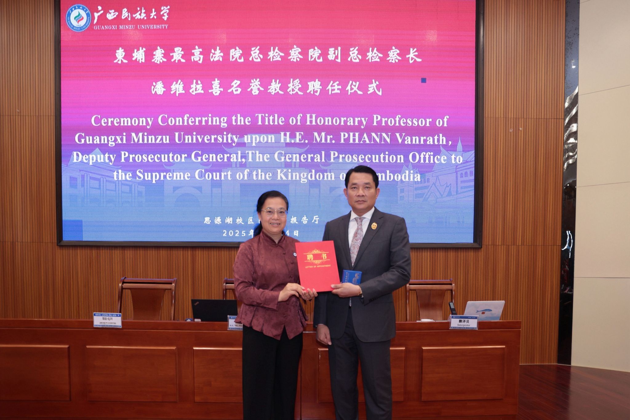 【大学生通讯社报道】11月24日下午,广西民族大学在思源湖校区图书馆二楼报告厅举行名誉教授聘任仪式,聘任柬埔寨最高法院总检察院副总检察长潘维拉喜(H. E. PHANN VANRATH)为名誉教授,校长韦仕珍出席仪式并为潘维拉喜颁发聘书。校党委副书记、中国-东盟法学院院长邓国彬出席并主持仪式。