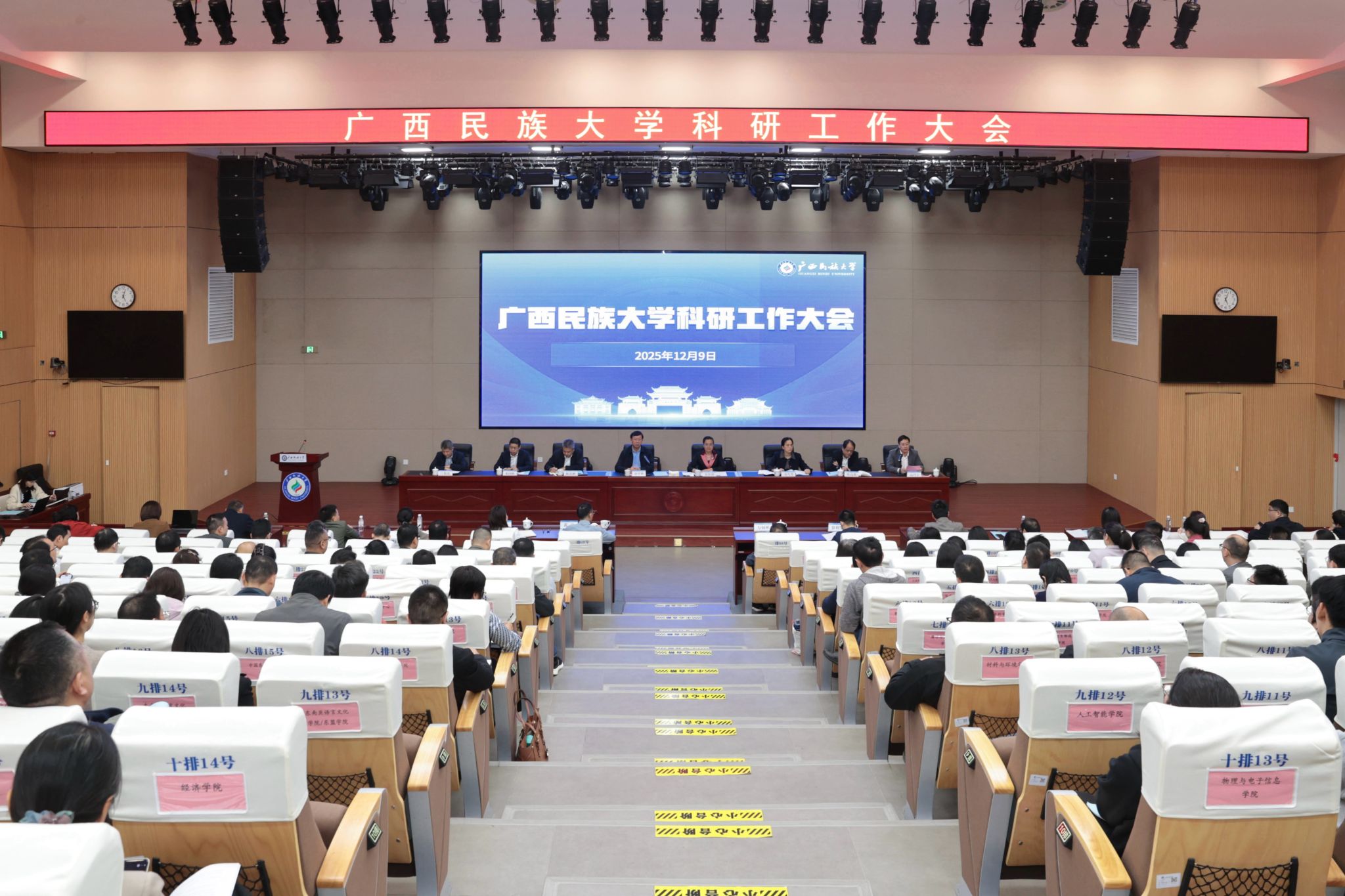 12月9日,广西民族大学在相思湖校区文化研习基地召开科研工作大会,本次大会以“创新驱动 科教融汇”为核心主题,立足学校发展全局,全面总结2018年以来学校科研工作成效与经验,研判当前面临的机遇挑战,统筹谋划并部署今后五年科研事业高质量发展的重点任务。校党委书记唐平秋、校长韦仕珍等在家校领导出席会议,特邀代表、各职能部门负责人、各学院科研工作者代表等参会。