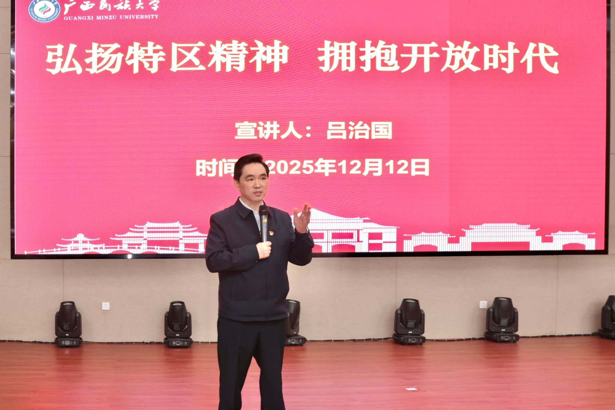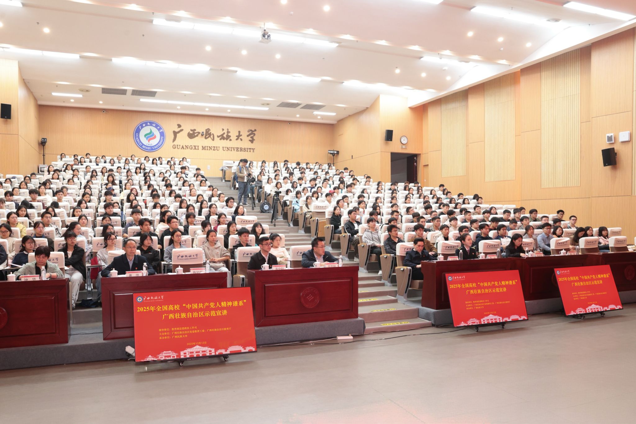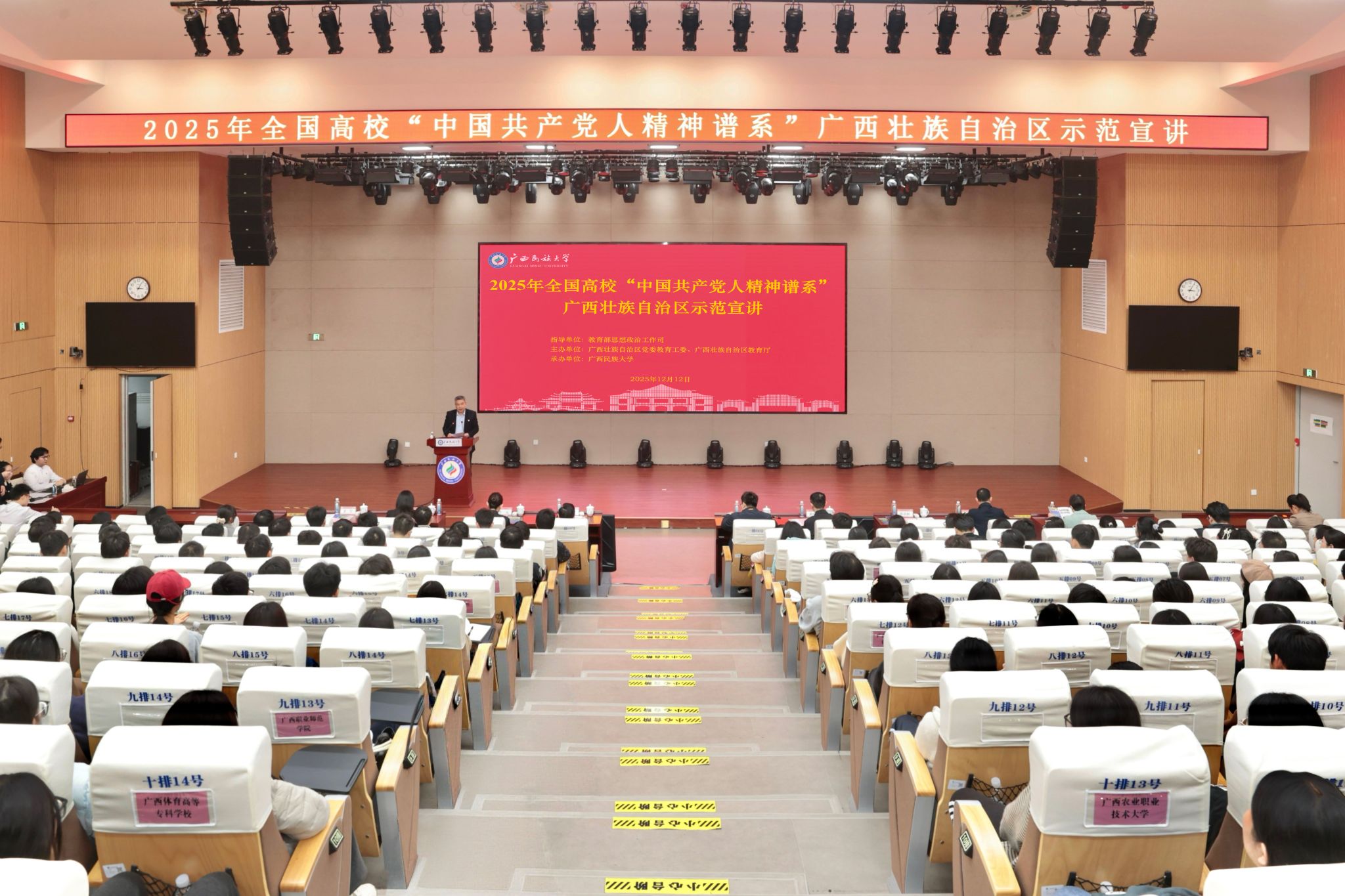 12月12日下午,由教育部思想政治工作司指导,广西壮族自治区党委教育工委、自治区教育厅主办,广西民族大学承办的2025年全国高校“中国共产党人精神谱系”广西壮族自治区示范宣讲在广西民族大学相思湖校区文化研习基地举行。中教华影数字服务股份有限公司副总经理、中国大学生在线及全国高校思想政治工作网常务副主任张治国出席活动,广西民族大学党委副书记陈铭彬致欢迎辞,自治区党委教育工委宣传部部长、教育厅思政处处长黄中阳,广西民族大学有关部门负责同志,驻邕有关高校师生代表参加活动。