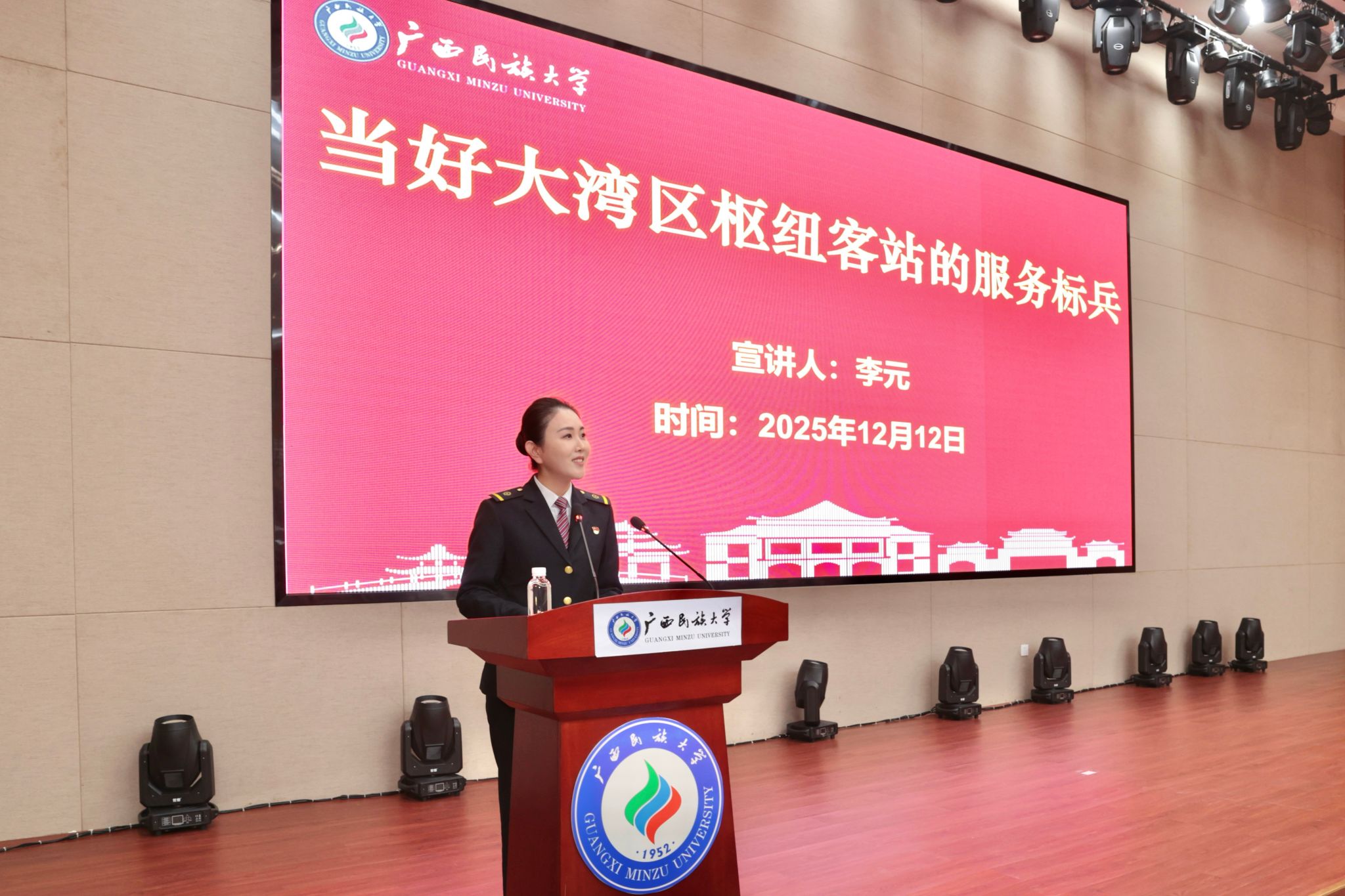 宣讲环节中,海南热带海洋学院党委副书记、校长吕治国以“弘扬特区精神,拥抱开放时代”为题,阐释了“敢闯敢试、敢为人先、埋头苦干”的特区精神核心内涵,展现了改革开放精神在新时代的生动实践;广西民族大学党委副书记陈铭彬以“传承中国共产党人精神谱系,践行青年历史使命”为题,系统梳理了精神谱系的历史脉络与时代内涵,引导青年学子从党的精神财富中汲取前行力量;中国铁路广州局集团有限公司深圳车站深圳北站“迎春花”服务队队长李元以“当好大湾区枢纽客站的服务标兵”为题,通过亲身服务旅客的鲜活高铁故事,展现了基层岗位上的坚守与奉献。
