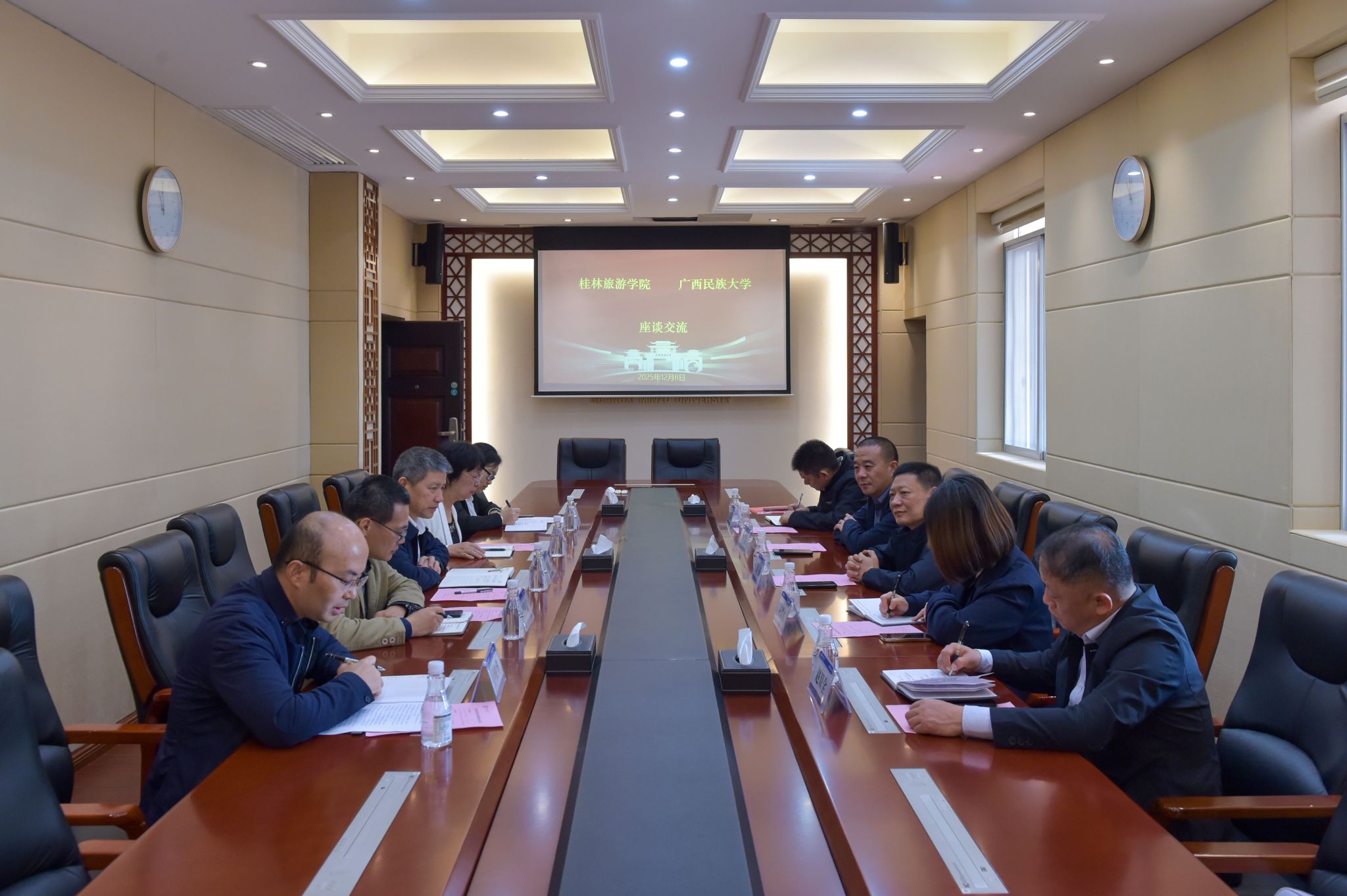 12月9日,校党委常委、副校长吕俊彪会见来访的桂林旅游学院副校长刘旸一行,双方围绕校内商业街管理运营模式、食堂管理成功做法等内容进行深入交流。(初审/卢俊华 图文/吴浩 编/梁晶晶 实习编辑:梁火琼 杨诗琦 复审/韦利坤 终审/孙寿媚)