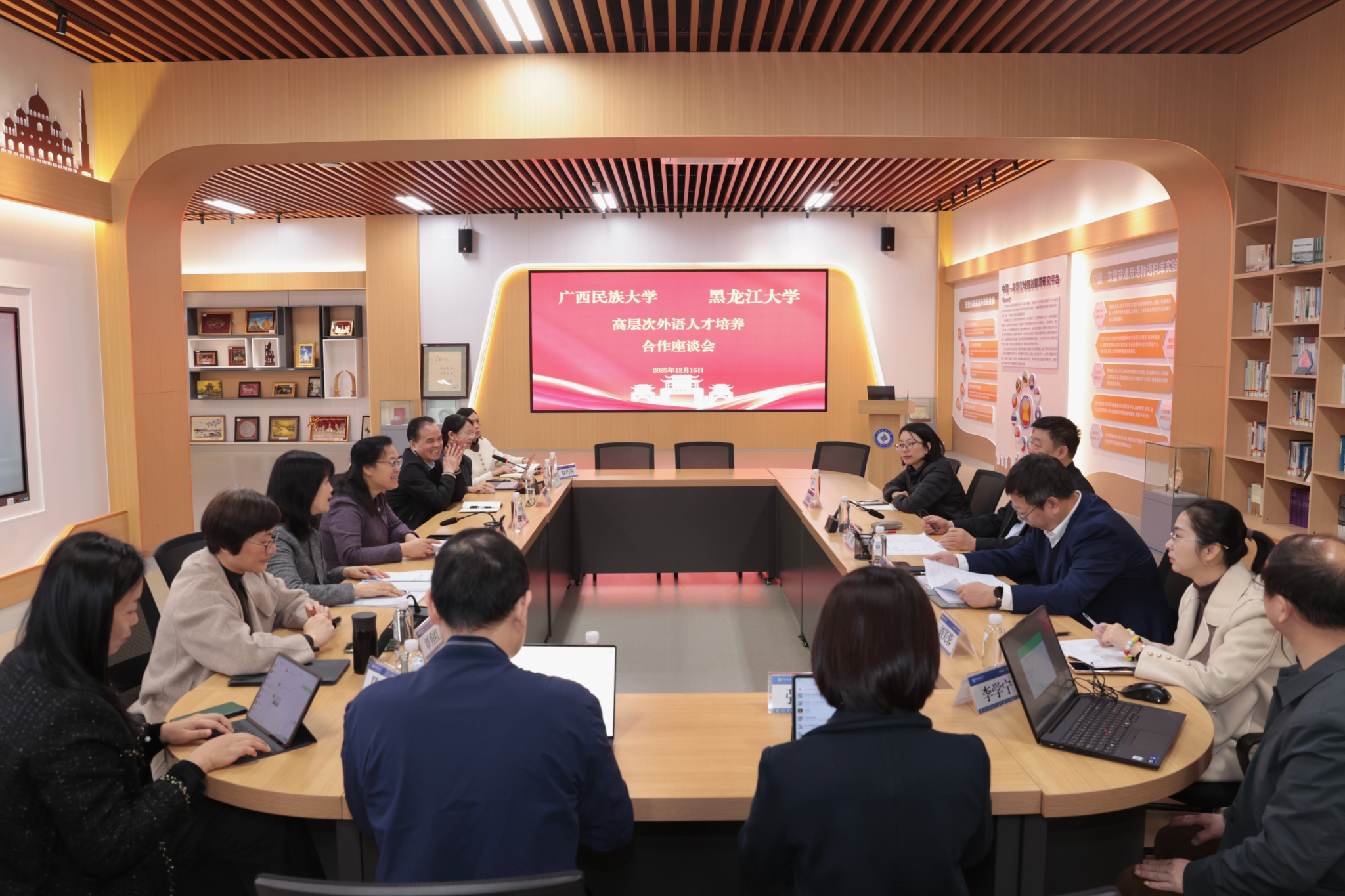 【大学生通讯社报道】12月15日上午,广西民族大学在相思湖校区文化研习基地区域国别成果展厅召开座谈会,与黑龙江大学共商人才培养合作事宜。广西民族大学校长韦仕珍,黑龙江大学原副校长严明出席座谈会,双方有关部门负责人参加座谈。