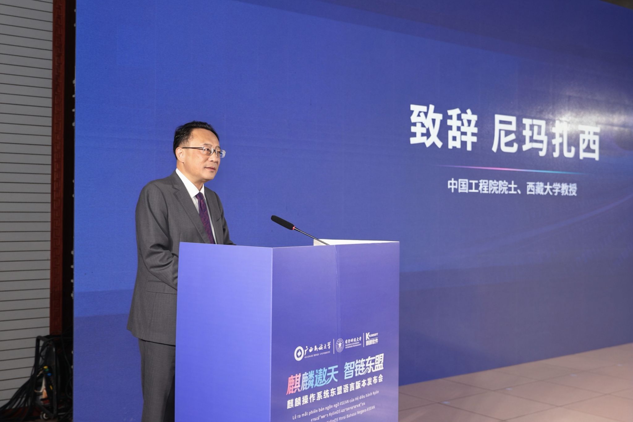 【大学生通讯社报道】12月18日下午,麒麟操作系统东盟语言版本发布会在广西民族大学相思湖校区科技楼报告厅举行。中国工程院院士、西藏大学教授尼玛扎西,广西民族大学党委书记唐平秋,广西壮族自治区科学技术协会副主席、一级巡视员刘家凯,广西壮族自治区教育厅副厅长张元良,广西壮族自治区大数据发展局党组成员、副局长黄永刚,广西壮族自治区科技厅二级巡视员莫冰云,麒麟软件有限公司党委副书记、总经理孔金珠出席现场会议。中国工程院院士、国防科技大学研究员廖湘科线上出席会议。会议采用线上线下相结合的方式同步进行。
