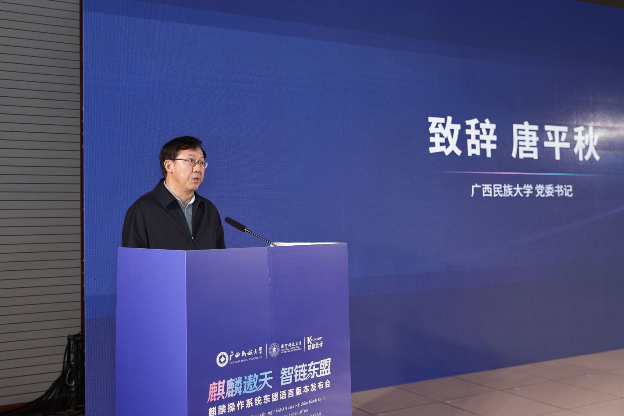 唐平秋对与会专家学者的到来表示欢迎,简要介绍了广西民族大学在人工智能、东盟研究等领域取得的成果。他指出,此次与国防科技大学、麒麟软件联合研发的麒麟操作系统东盟语言版本发布,是学校响应国家“十五五”规划“人工智能+”战略的切实举措。该项产品成功落地,将为共建“数字丝绸之路”提供有力保障,希望以此次发布会为契机,立足广西核心枢纽与合作高地的独特优势,以科技创新为引,扎实推进区域经济社会高质量发展,携手构建更为紧密的中国-东盟命运共同体。