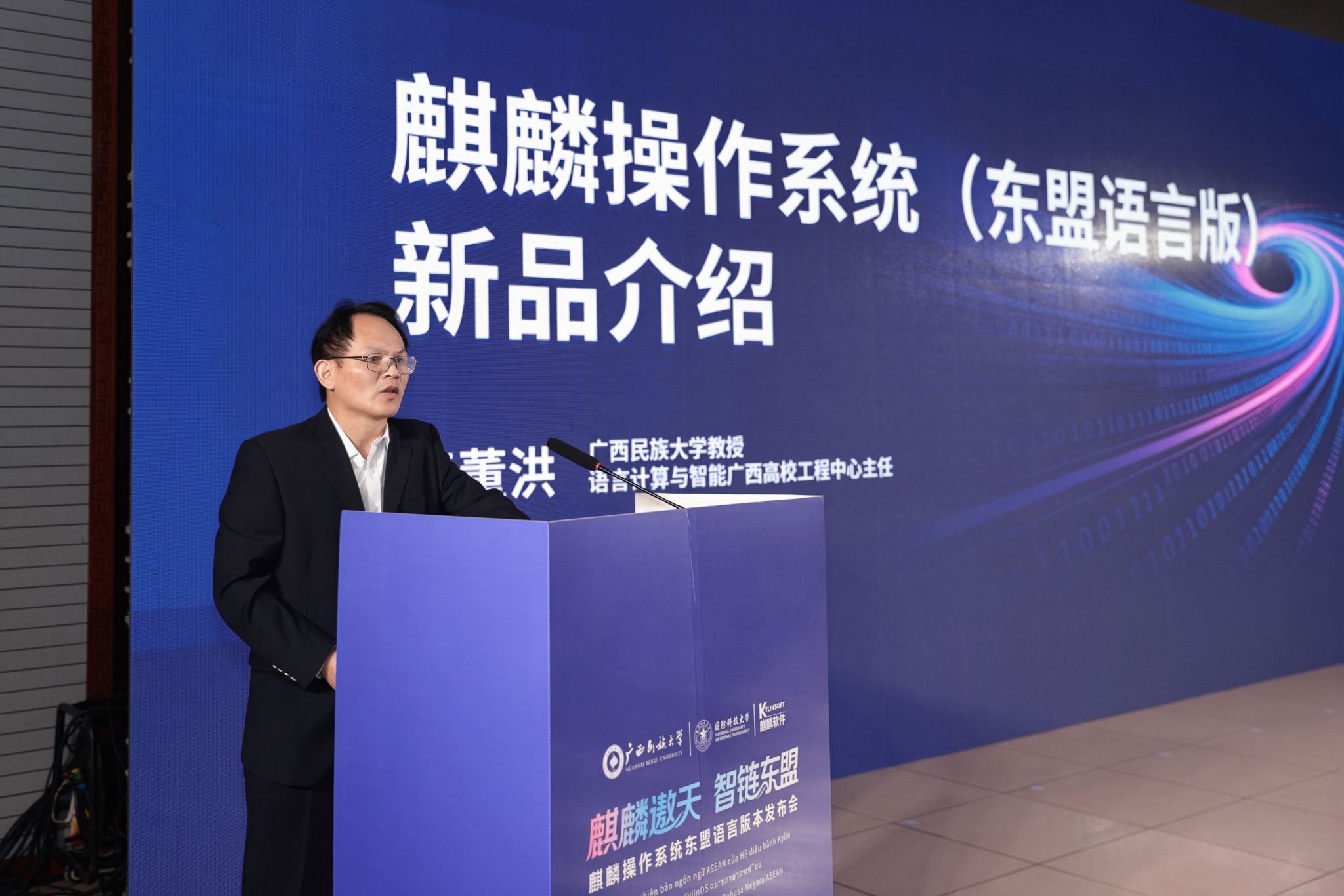 广西民族大学教授、语言计算与智能广西高校工程研究中心主任秦董洪就“麒麟操作系统(东盟语言版)新品介绍”作专题分享。