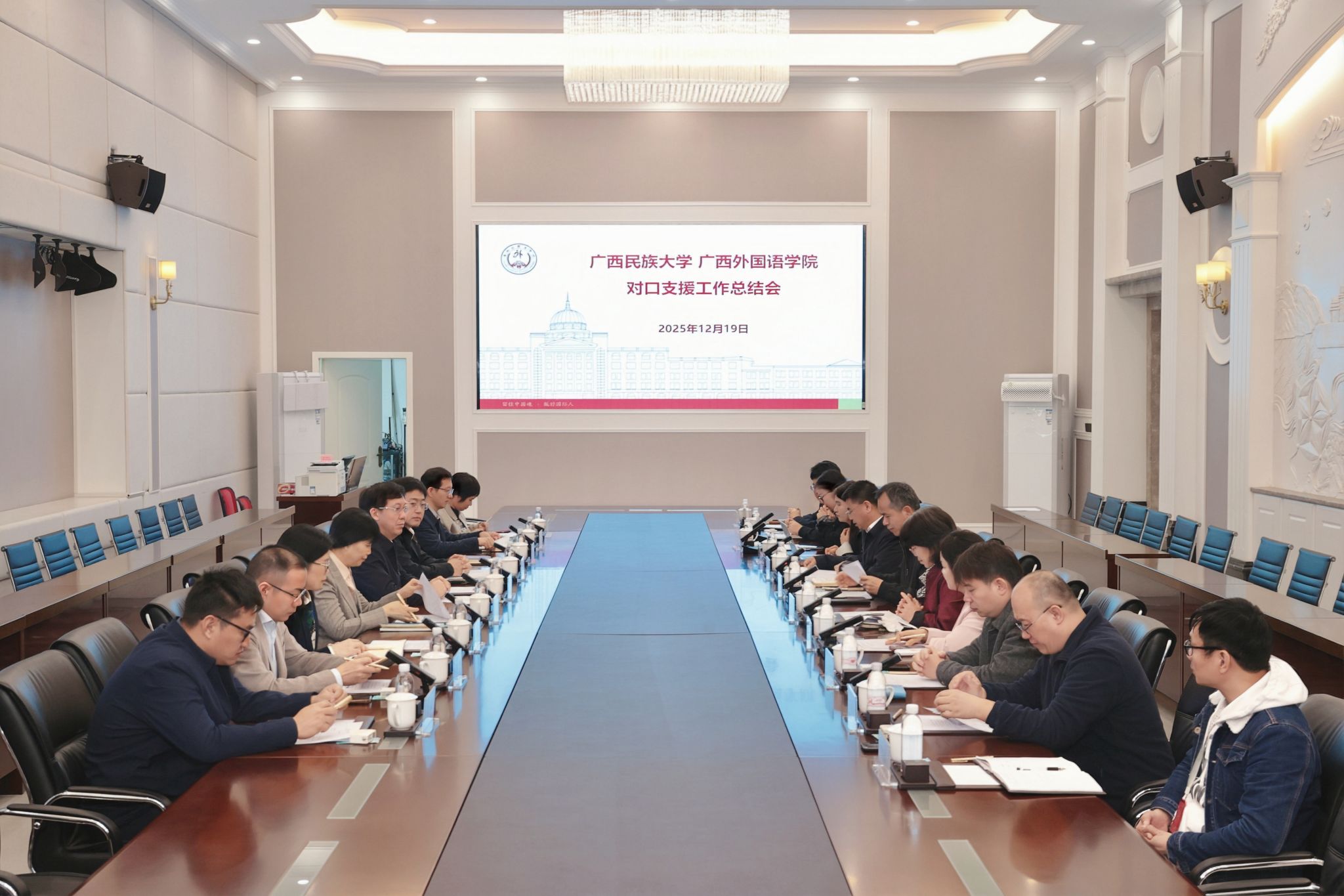 12月19日上午,广西民族大学党委书记唐平秋带队赴广西外国语学院开展对口支援工作总结交流,广西外国语学院党委书记周瑞超,执行校长吕玲丽,广西民族大学副校长高兴宇等出席总结会,广西外国语学院有关部门负责人参加。