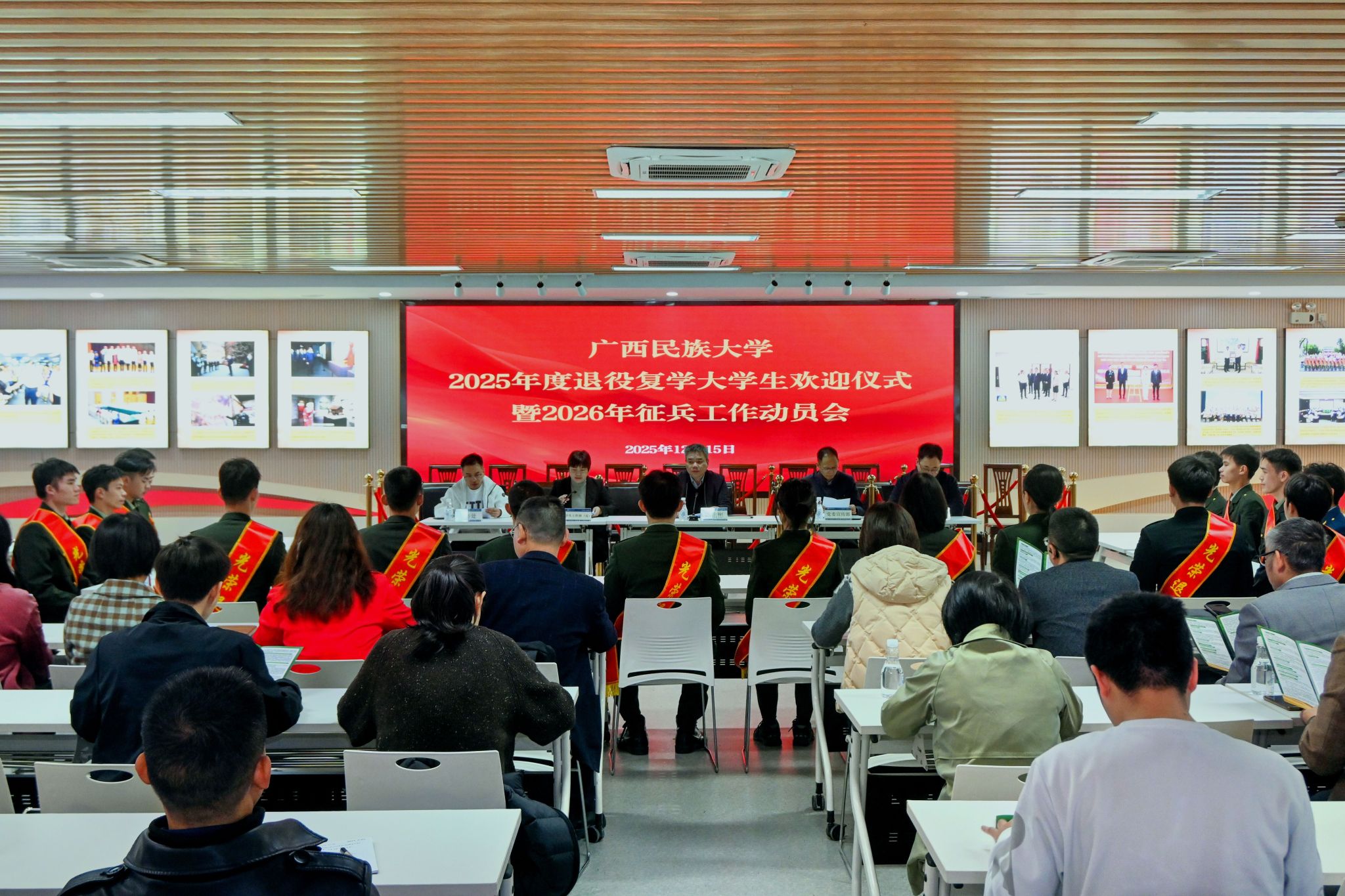 12月15日,校党委副书记陈铭彬在广西民族大学2025年度退役复学大学生欢迎仪式暨2026年征兵工作动员会上要求,各学院要形成责任清晰、推进有力的工作链条,坚持“宣传—动员—服务”全流程覆盖,加强与武装部的信息资源共享,注重兵员质量与持续发展,希望退役复学学生把军营锻造的坚韧意志转化为学习实践的坚定动力,努力成长,积极投身到征兵宣传与服务工作中。(初审/肖耀科 图/张小逸 文/徐子强 实习记者:张小逸 编/黎倩雅 复审/韦利坤 终审/孙寿媚)