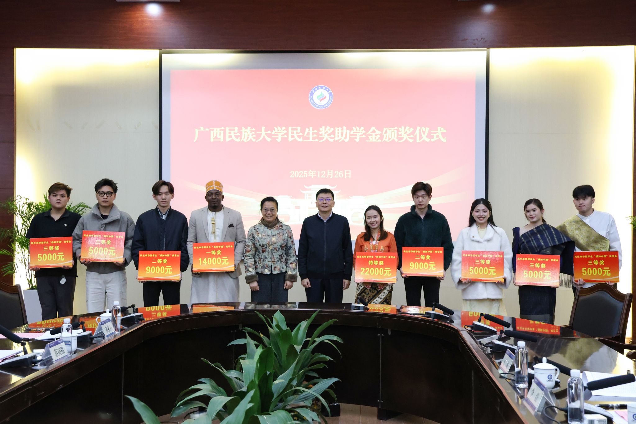 中国民生银行股份有限公司南宁分行代表,学校学生工作部(处)、财务处、国际合作与交流处、有关学院负责人及获奖学生代表参加仪式。(初审:罗少科 复审:韦利坤 终审:孙寿媚)