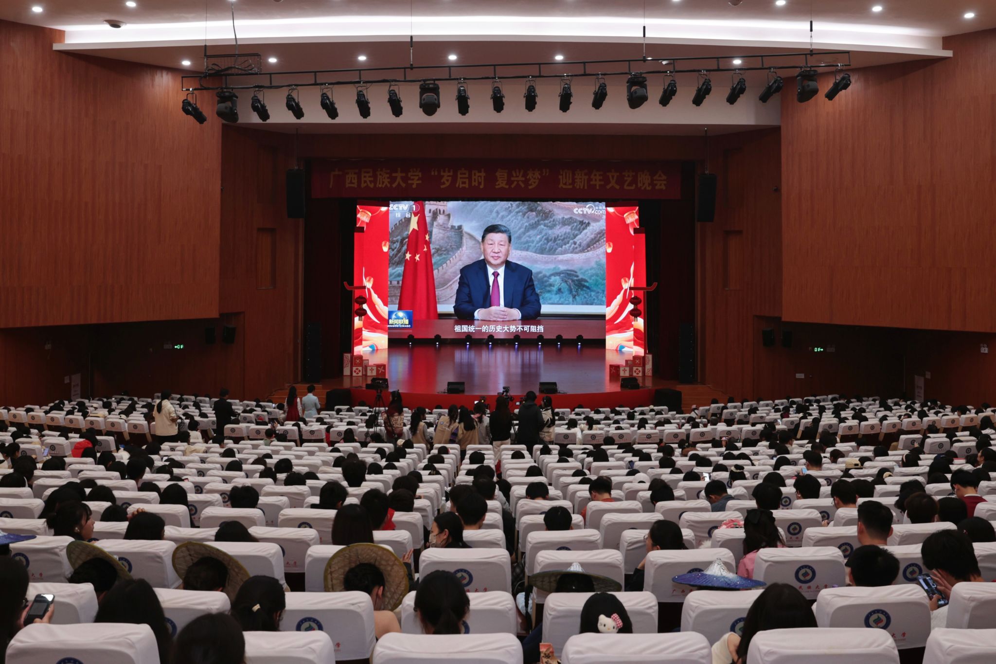 【大学生通讯社报道】国家主席习近平于12月31日晚7时通过中央广播电视总台和互联网,发表二〇二六年新年贺词。广西民族大学校领导和全校师生代表在思源湖校区大礼堂集中收看直播。