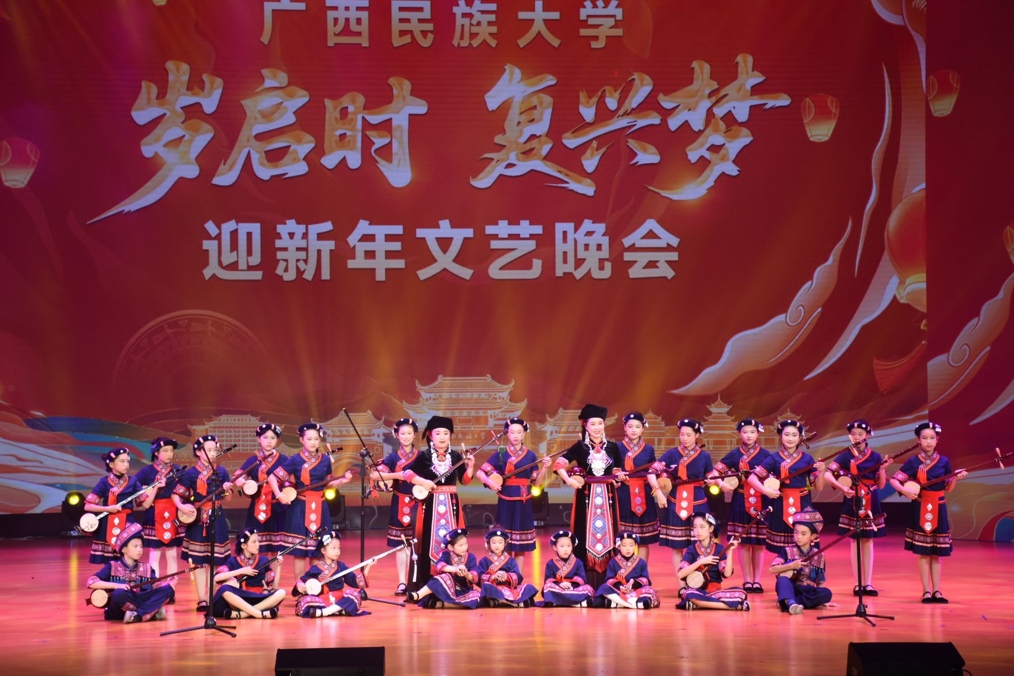 晚会在舞蹈《相亲相爱》中拉开帷幕。学校民乐团带来的大型民族交响乐《春节序曲》展现阖家团圆的温馨、辞旧迎新的欢腾;舞蹈《洗衣歌》和大合唱《保卫黄河》情感真挚、磅礴大气,展现了新时代离退休老同志热爱生活、活力依旧的精神风貌;小组唱《天之琴》以清澈的童声唱响古老传说连通天地的旋律;学校合唱团带来的原生态歌曲《蝴蝶歌》歌声如蝶翼轻振,吟唱着纯净和鸣;舞蹈《赛博未来》以光影编织数字想象,跃动着科技青春的无限可能;歌曲《我是你的朋友》唱响跨越山海的相遇,传递相聚相思湖的温暖情谊;歌曲《写故事的人》以动人旋律,赞颂孜孜不倦的坚守;南宁职业技术大学带来舞蹈《向阳而生》,舞姿昂扬,绽放青春活力;歌曲《山笑水笑人欢乐》在广西艺术学院的演绎中,传递出绿水青山间洋溢的喜悦;大型音诗画《那一抹中国红·伟业》深情表达了对祖国的无限热爱与美好祝愿;最后,全场观众挥舞国旗齐声高唱《歌唱祖国》,晚会圆满落下帷幕。全体参演人员与学校领导合影留念。