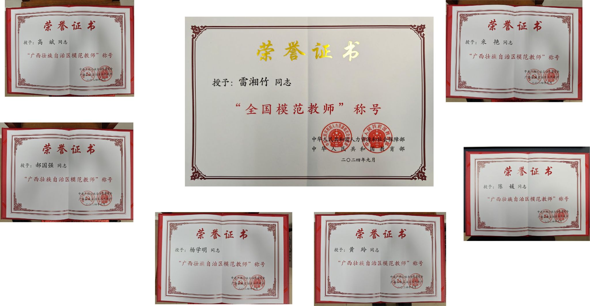“十四五”时期,学校涌现出一批优秀教师典型,其中全国模范教师1人、全国高校黄大年式教师团队1个、广西教学名师2人、自治区模范教师6人、自治区优秀教师4人、自治区优秀教育工作者1人。