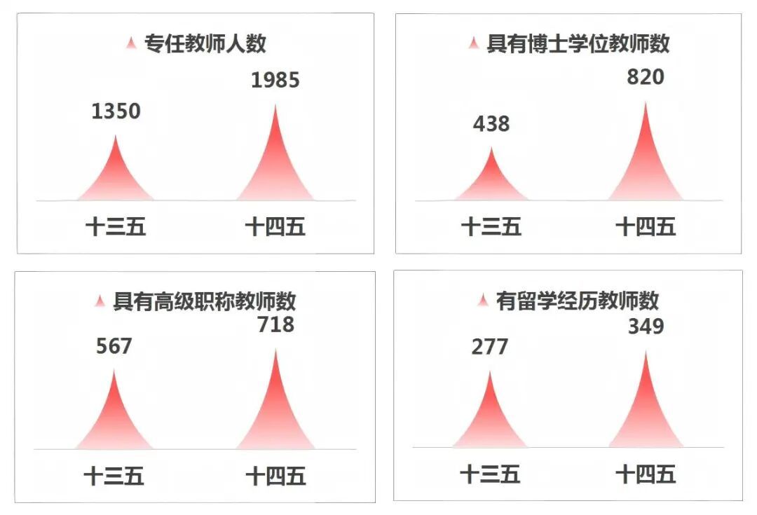 (二)完善教职工继续教育制度,鼓励教师赴国内外进修。“十四五”时期送培143人攻读博士,选派86人做访问学者,支持43人开展博士后研究,累计派出62人赴国外留学访学,不断提升教师国际化水平。