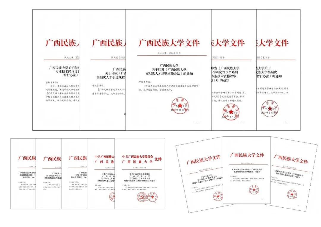 (一)学校深化岗位设置与聘用改革,激发人才队伍活力。修订《广西民族大学专业技术岗位设置与聘用管理暂行办法》,完成第四轮岗位聘用工作,严格聘期考核,推行“能上能下”,打破“论资排辈”。“十四五”时期累计完成1643人岗位聘用,841人晋升岗位等级,岗位管理导向作用显著增强。推进绩效分配改革,激发干事创业动力。修订绩效工资和绩效考核等多个文件办法,突出教学育人和科研育人,打破“平均主义”,实现工资收入稳步增长,有效激发教职工积极性。