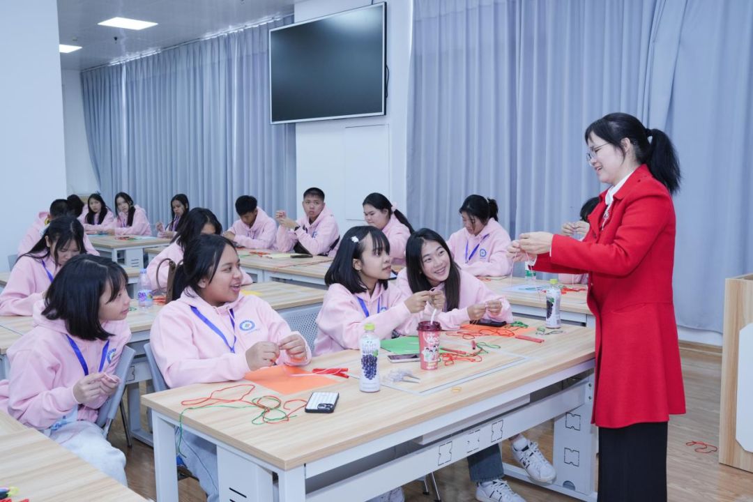 2025年11月,2025“泰国学生看广西”中泰青年交流研学营在广西民族大学举办。图为泰国学生体验中华结艺课程。