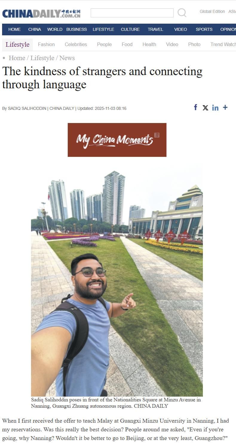 广西民族大学马来西亚籍教师萨迪克·萨利赫丁文章《陌生人的善意与语言联结》在《中国日报网》发表,深情讲述“绿城”南宁的温暖故事与文明互鉴感悟。