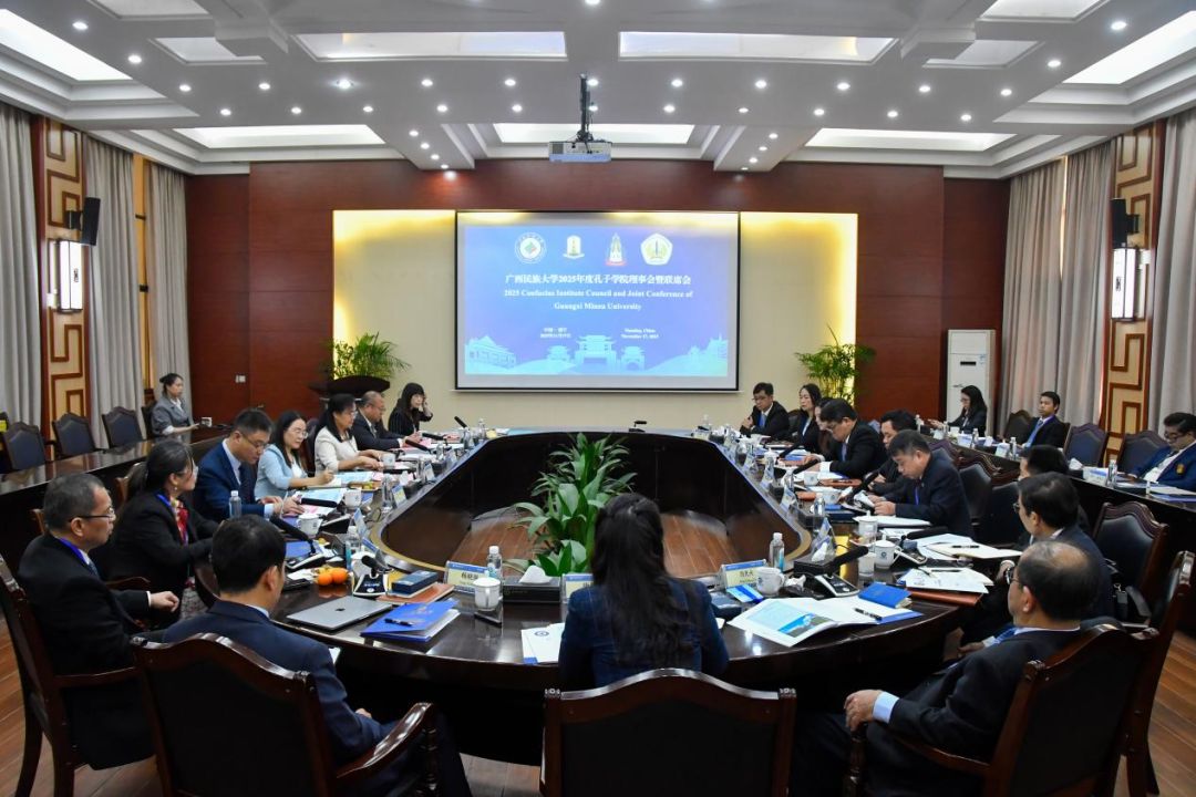 2025年11月17日,广西民族大学召开2025年度孔子学院理事会暨联席会,泰国玛哈沙拉坎大学代表团、老挝国立大学代表团、印度尼西亚丹戎布拉大学代表团出席会议。