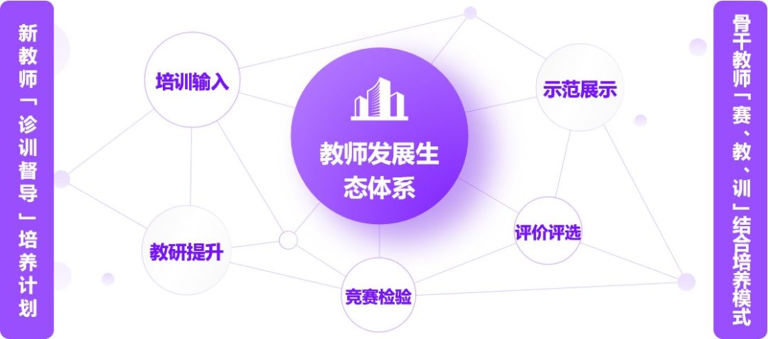完善培养体系,助力教师成长。构建“培训输入—教研提升—竞赛检验—评价评选—示范展示”五位一体教师发展生态体系,实施新教师“诊训督导”培养计划和骨干教师“赛、教、训”结合培养模式。通过线上线下融合、内外协同互补、校院两级联动,开展覆盖全体教师的分层分类培训,推动教师发展向个性化、全员化、常态化迈进。