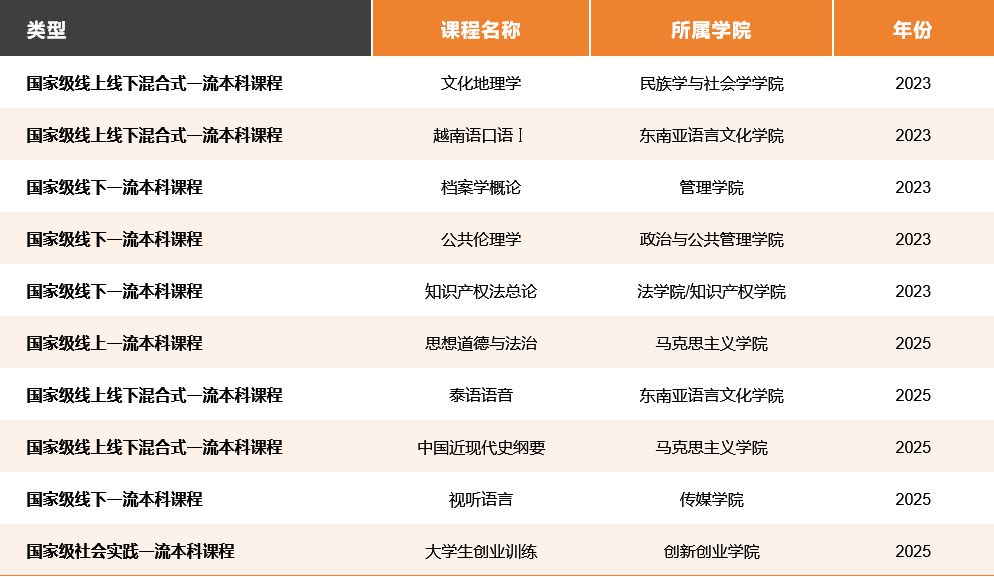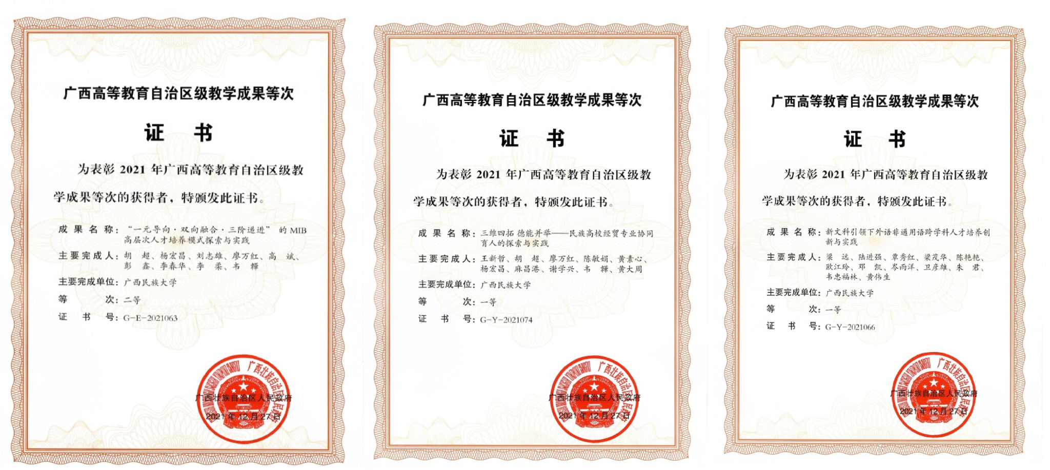 完善体制机制,推进教学改革。系统修订项目管理办法并制定“四新”建设方案。五年来共获自治区级教改项目立项204项,国家民委教改项目21项;获批教育部新文科研究与改革实践项目1项,自治区级“四新”项目11项;职教改立项9项;获自治区级高等教育教学成果奖20项。教材建设取得突破,东南亚语言文化学院2021年获“全国教材建设先进集体”称号,2022年、2024年共有7种教材获评广西普通本科高校优秀教材。