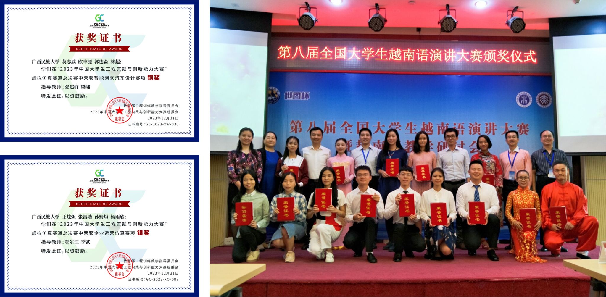以赛促学促教,竞赛成果丰硕。构建学科竞赛支持体系,近五年学生在各类学科竞赛中获得国际级奖项46项、国家级1310项、省部级11106项。在全国大学生越南语演讲大赛、数学建模大赛、工程实践与创新能力大赛等高水平赛事中屡创佳绩。在第十五届全运会上实现广西代表团空手道项目奖牌“零的突破”,荣获学校历史上首枚全运会奖牌。