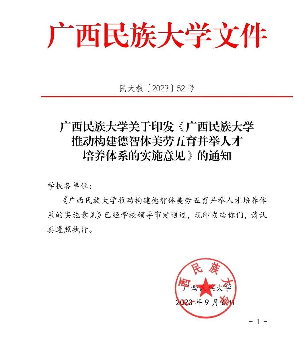 学校出台《广西民族大学推动构建德智体美劳五育并举人才培养体系的实施意见》。