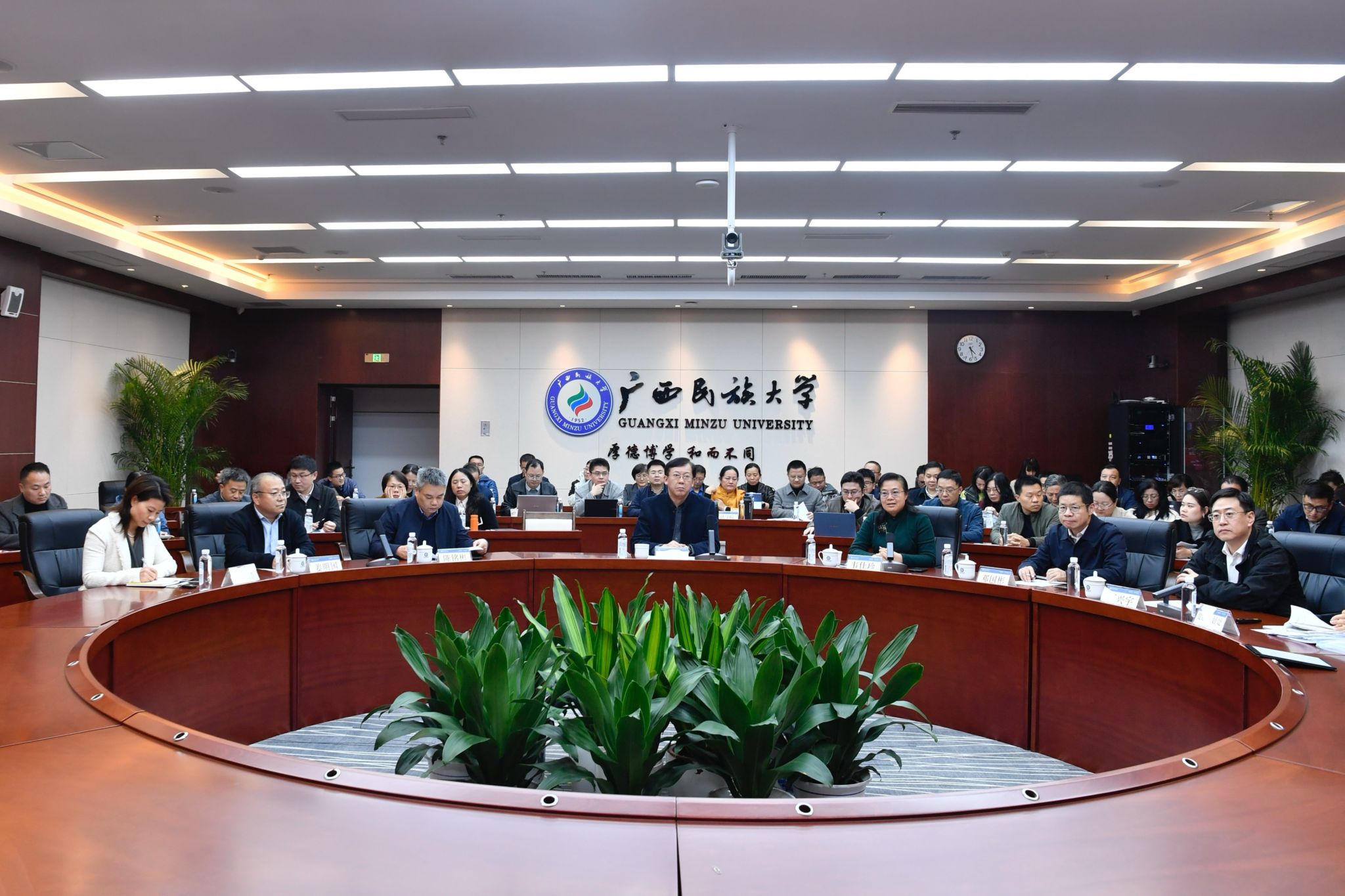 【大学生通讯社报道】1月11日—14日,广西民族大学在相思湖校区文化研习基地召开2026年第一次学科建设工作推进会。党委书记唐平秋,校长韦仕珍,校领导陈铭彬、邓国彬、吕俊彪、姜明国、高兴宇出席会议并指导,学校有关部门负责人及申博工作专班全体成员参加会议。