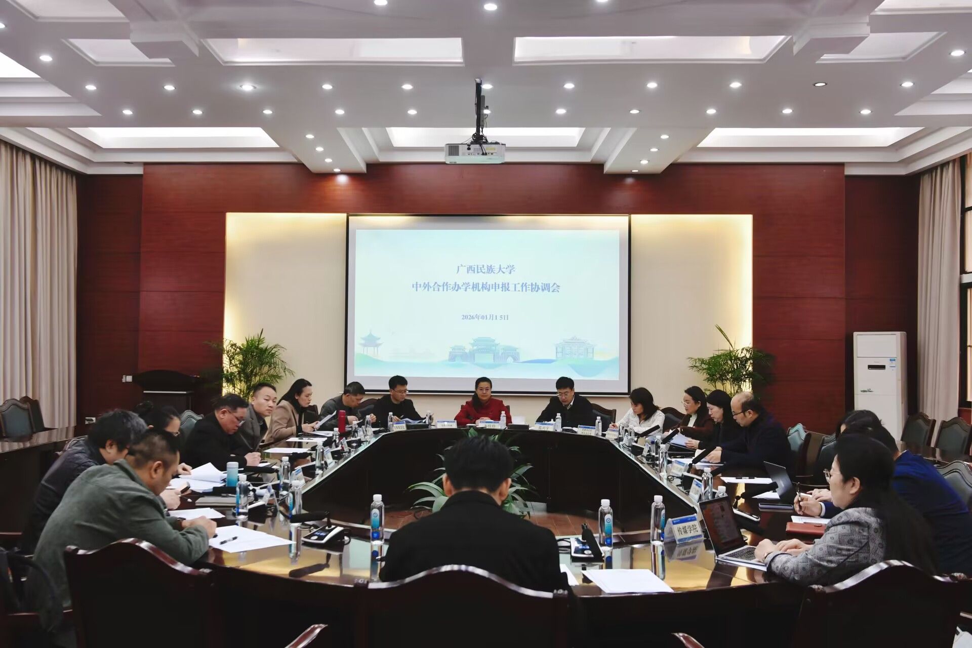 【大学生通讯社报道】1月15日上午,广西民族大学在相思湖校区国际合作与交流处大会议室召开中外合作办学机构申报工作协调会。校长韦仕珍、副校长高兴宇出席会议并指导,学校有关职能部门、拟申报学院负责人参加会议。