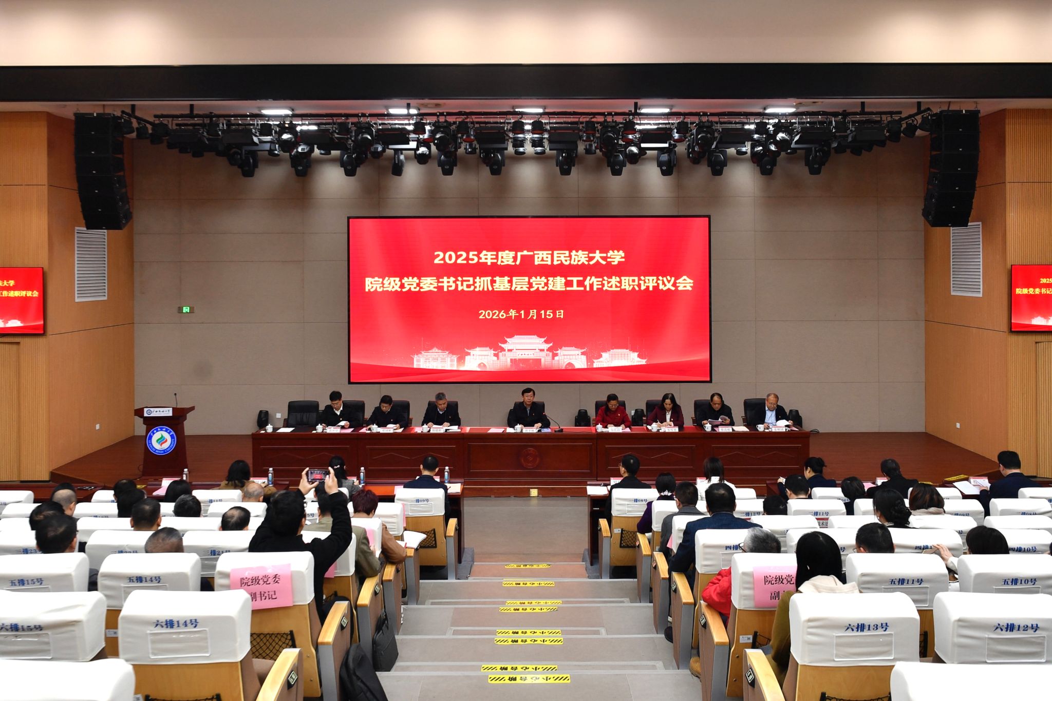 【大学生通讯社报道】1月15日上午,广西民族大学在文化研习基地召开2025年度院级党委书记抓基层党建工作述职评议会。学校党委书记唐平秋主持会议并讲话。校党委副书记、校长韦仕珍,校领导陈铭彬、韦雪芳、邓国彬、蔡高根、姜明国、高兴宇出席会议。