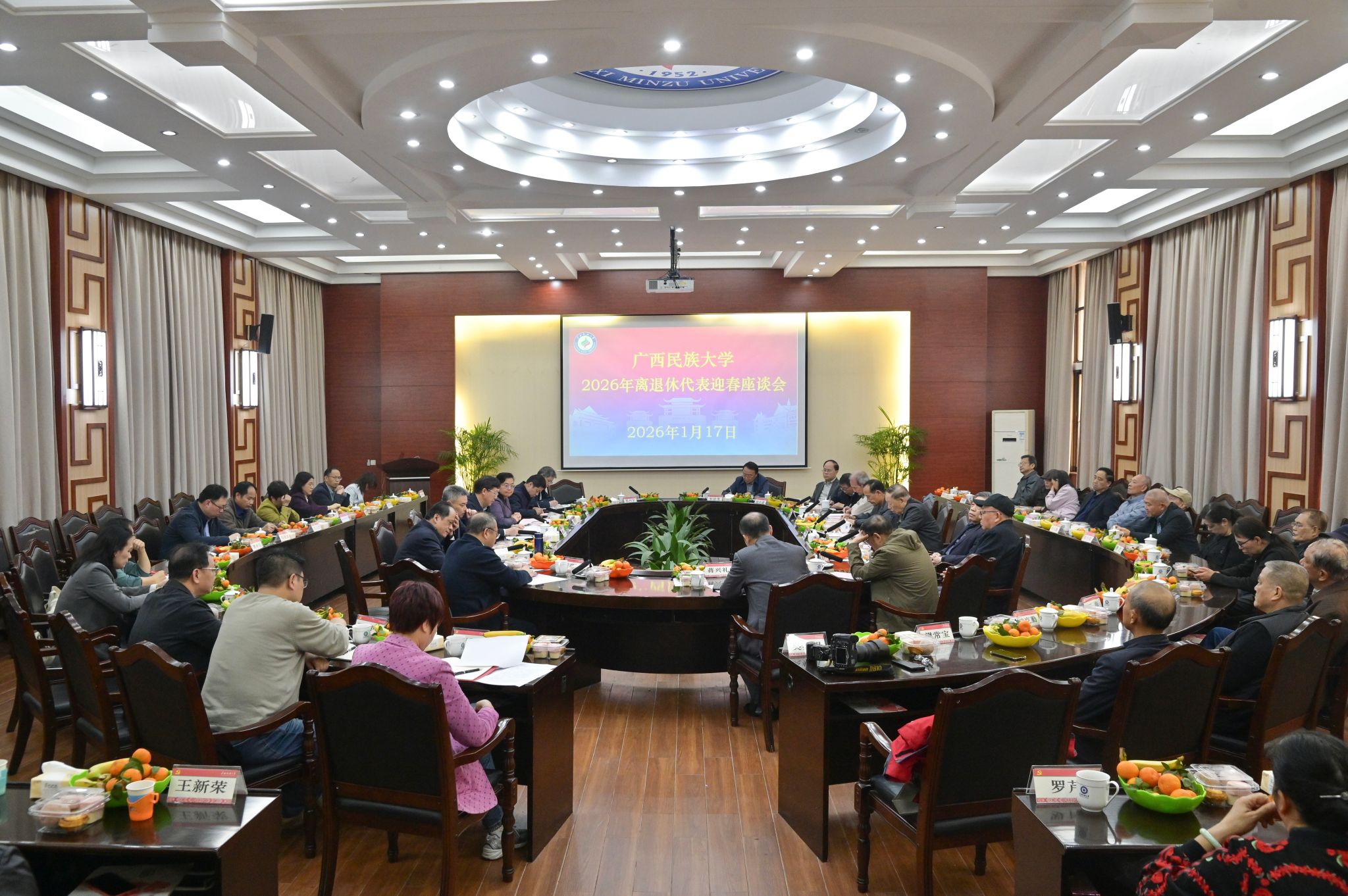 【大学生通讯社报道】1月17日下午,广西民族大学在国际合作与交流处大会议室召开2026年离退休代表迎春座谈会。学校党委书记唐平秋,党委副书记、校长韦仕珍,党委副书记陈铭彬、邓国彬,党委常委、副校长蔡高根、吕俊彪、姜明国,离退休教职工代表以及学校有关职能部门负责人与会。座谈会由校长韦仕珍主持。