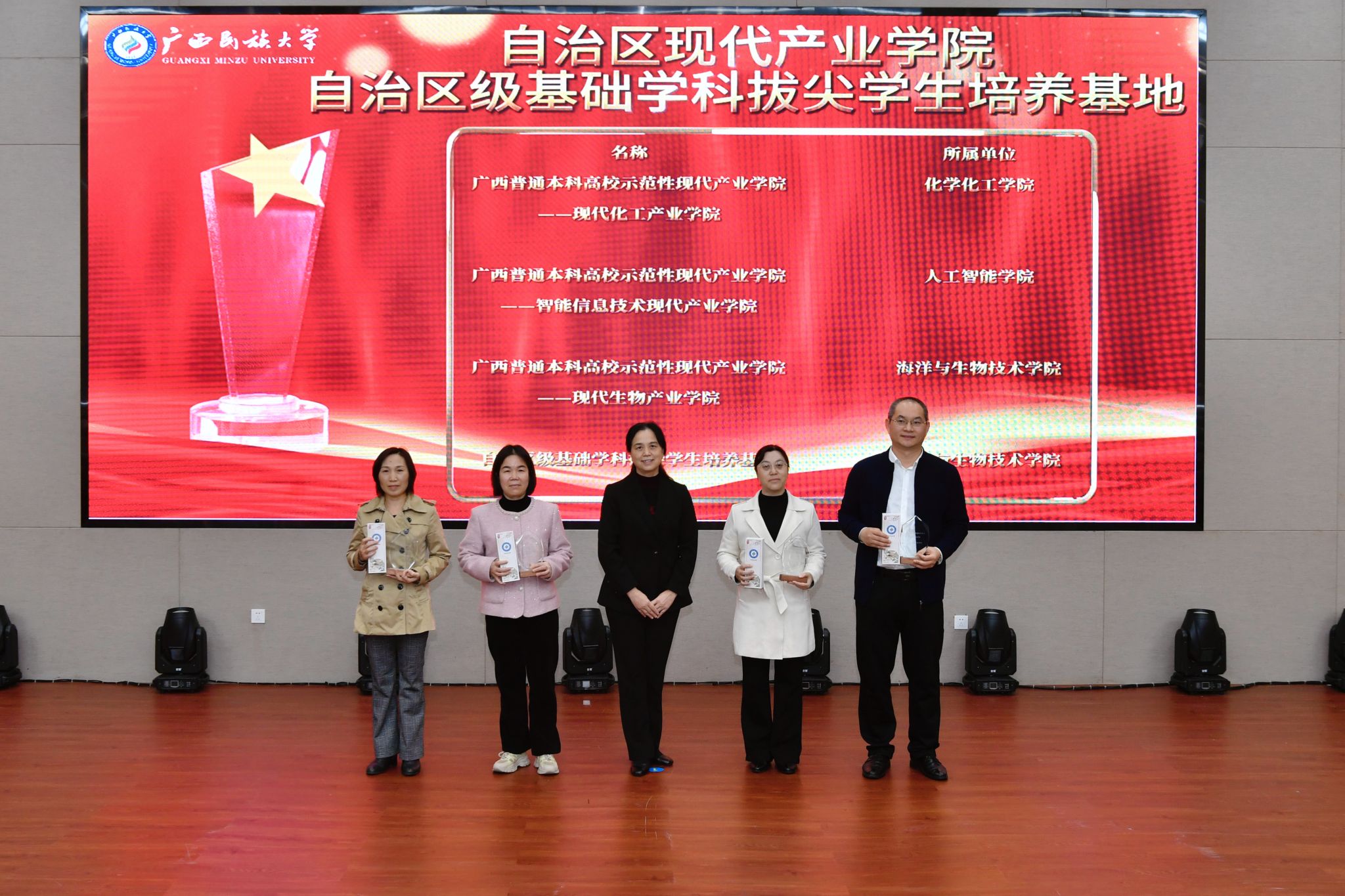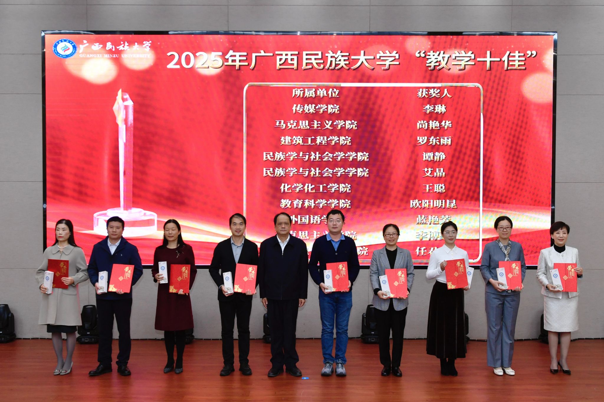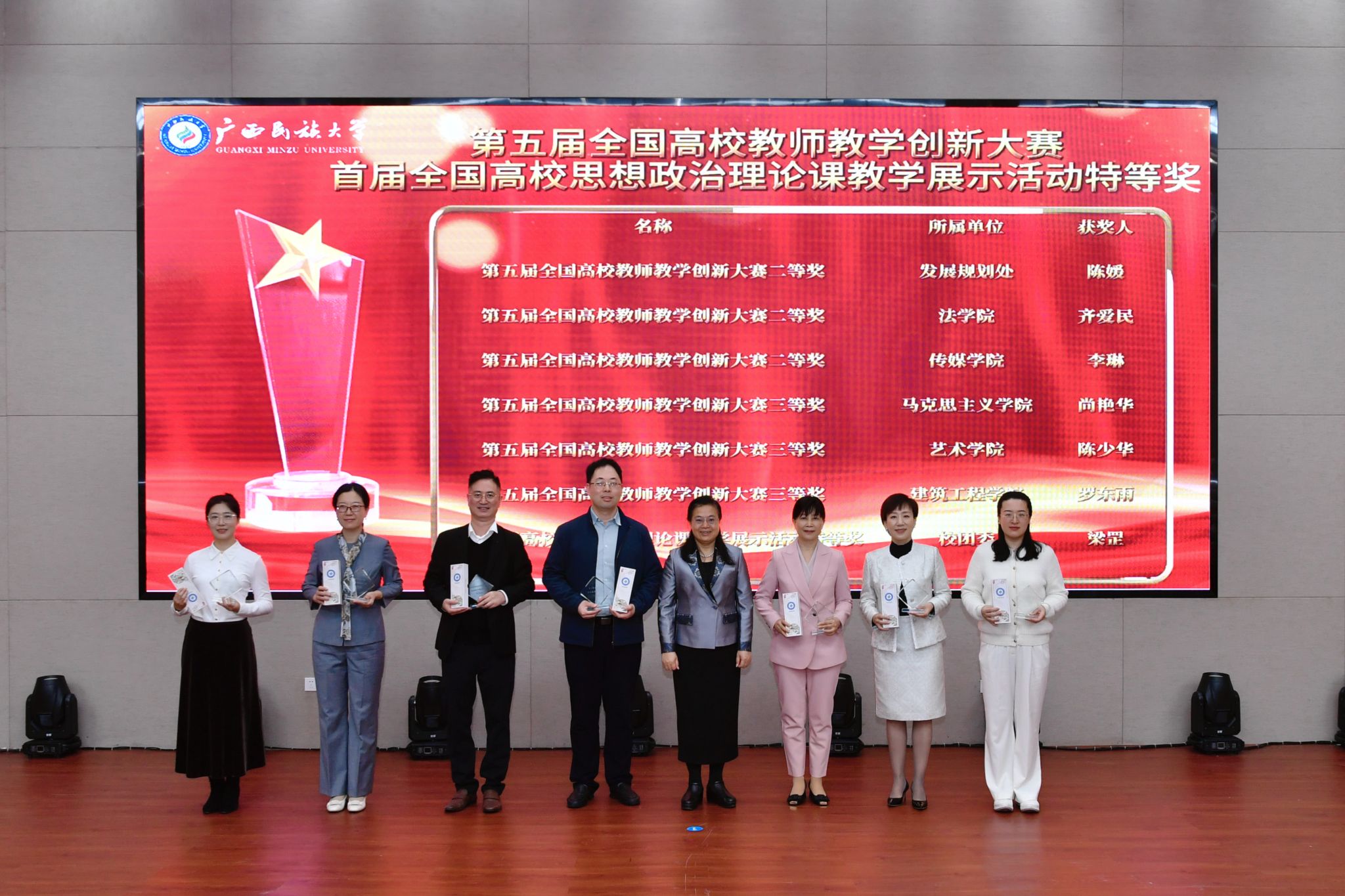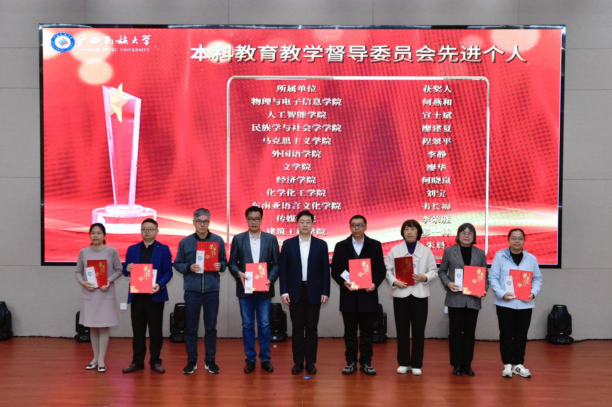 党委副书记陈铭彬宣读广西民族大学本科教学督导特别荣誉奖、督导先进个人、督导先进集体,以及广西民族大学“教学十佳”“教学新秀”的表彰名单;副校长姜明国介绍《广西民族大学教学业绩评价办法》《广西民族大学深化产教融合协同育人实施办法》《广西民族大学中国国际大学生创新大赛参赛奖励办法》等文件的起草和修订情况。