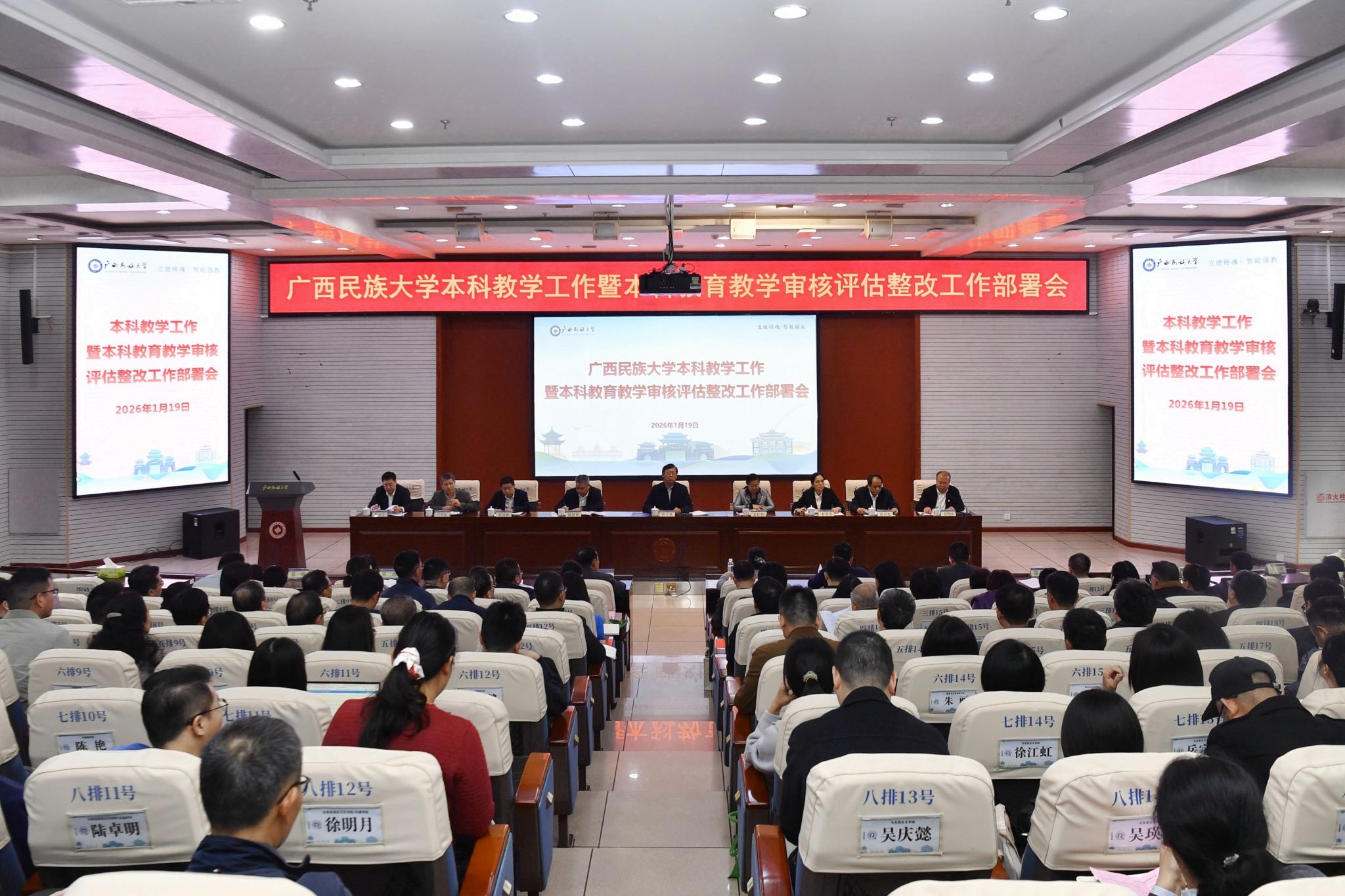 【大学生通讯社报道】1月19日上午,广西民族大学在相思湖校区文化研习基地召开学校本科教学工作暨本科教育教学审核评估整改工作部署会。校党委书记唐平秋、校长韦仕珍等全体校领导出席会议。获奖代表、各职能部门负责人、各教学科研单位代表参会。