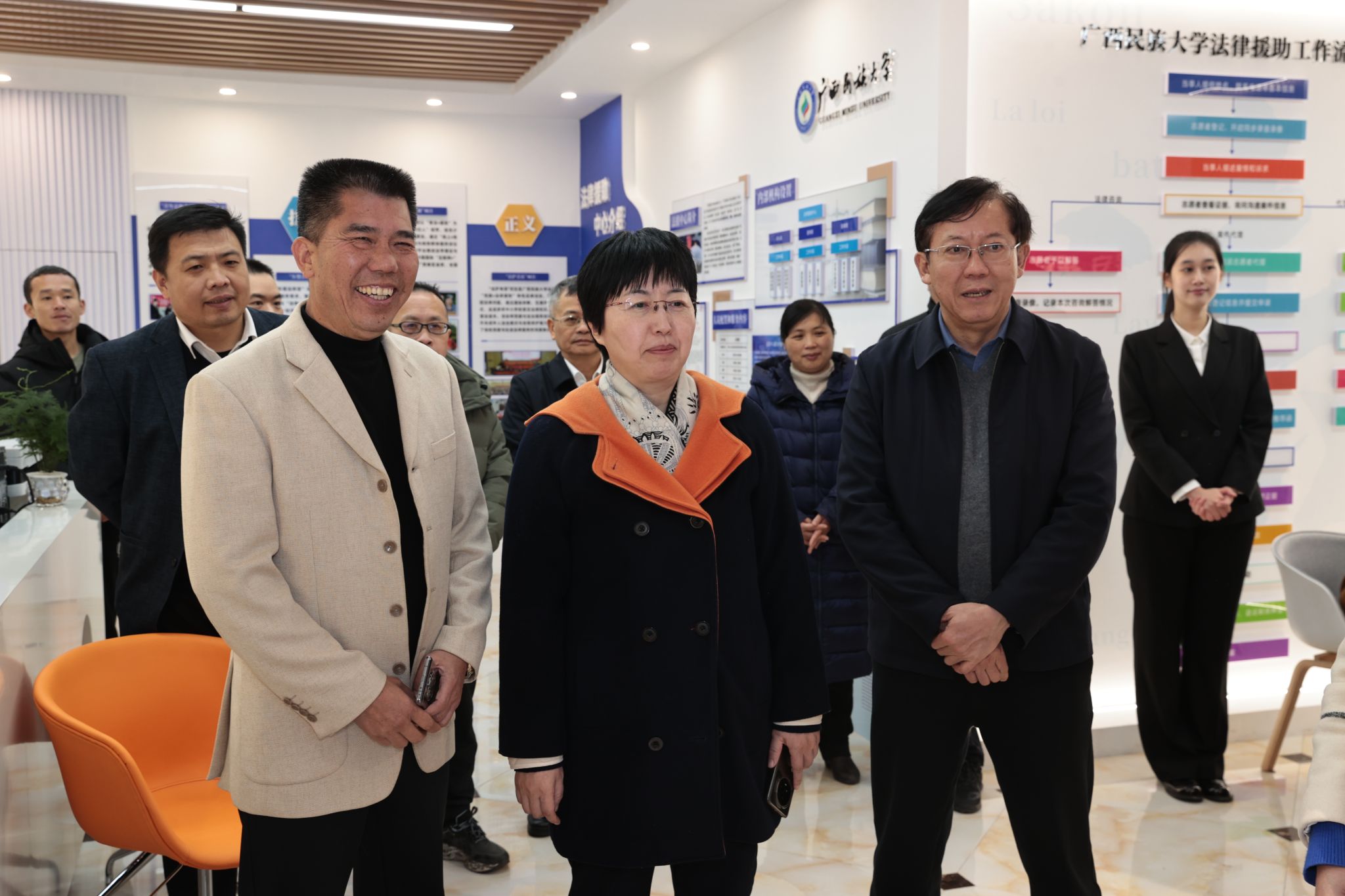在学校法律援助中心,调研组全面了解了广西民族大学在法律援助志愿服务、普法宣传、法治人才培养以及涉外法律服务等方面的显著成效,对学校将法学教育与社会服务深度结合、立足区位优势打造特色法治服务品牌的做法给予了肯定。