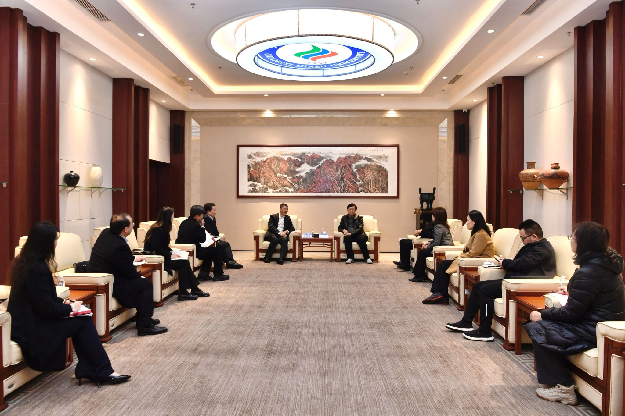 1月22日下午,中国银行广西壮族自治区分行党委书记、行长俞兆强,党委委员、副行长曹耀锋一行到访广西民族大学并开展座谈交流。校党委书记唐平秋,党委常委、副校长蔡高根出席座谈会,双方有关职能部门负责人参加会议。