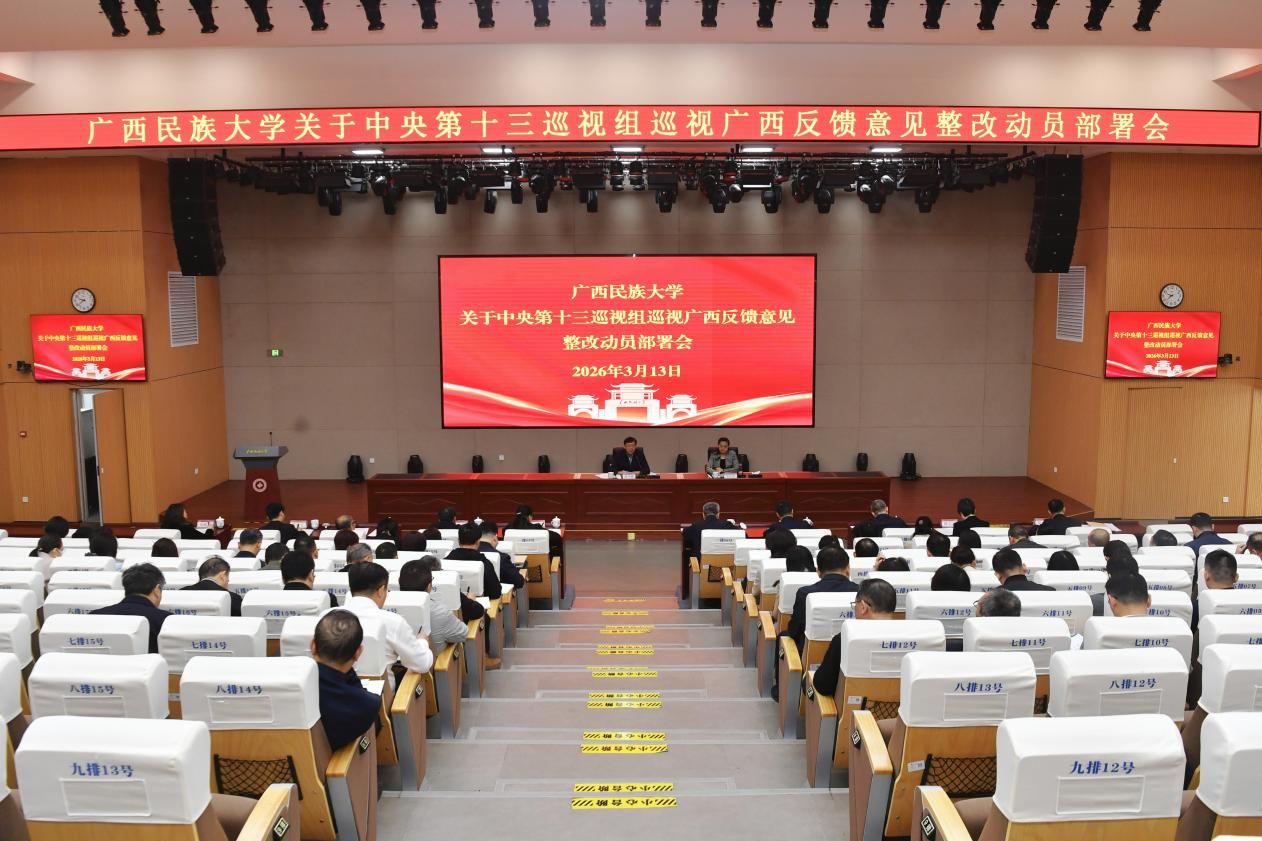 【大学生通讯社报道】3月13日上午,广西民族大学在相思湖校区研习基地召开中央第十三巡视组巡视广西反馈意见整改动员部署会。校党委书记唐平秋出席会议并讲话,党委副书记、校长韦仕珍主持会议。校领导陈铭彬、韦雪芳、邓国彬、蔡高根、吕俊彪、姜明国、周立亚出席会议。