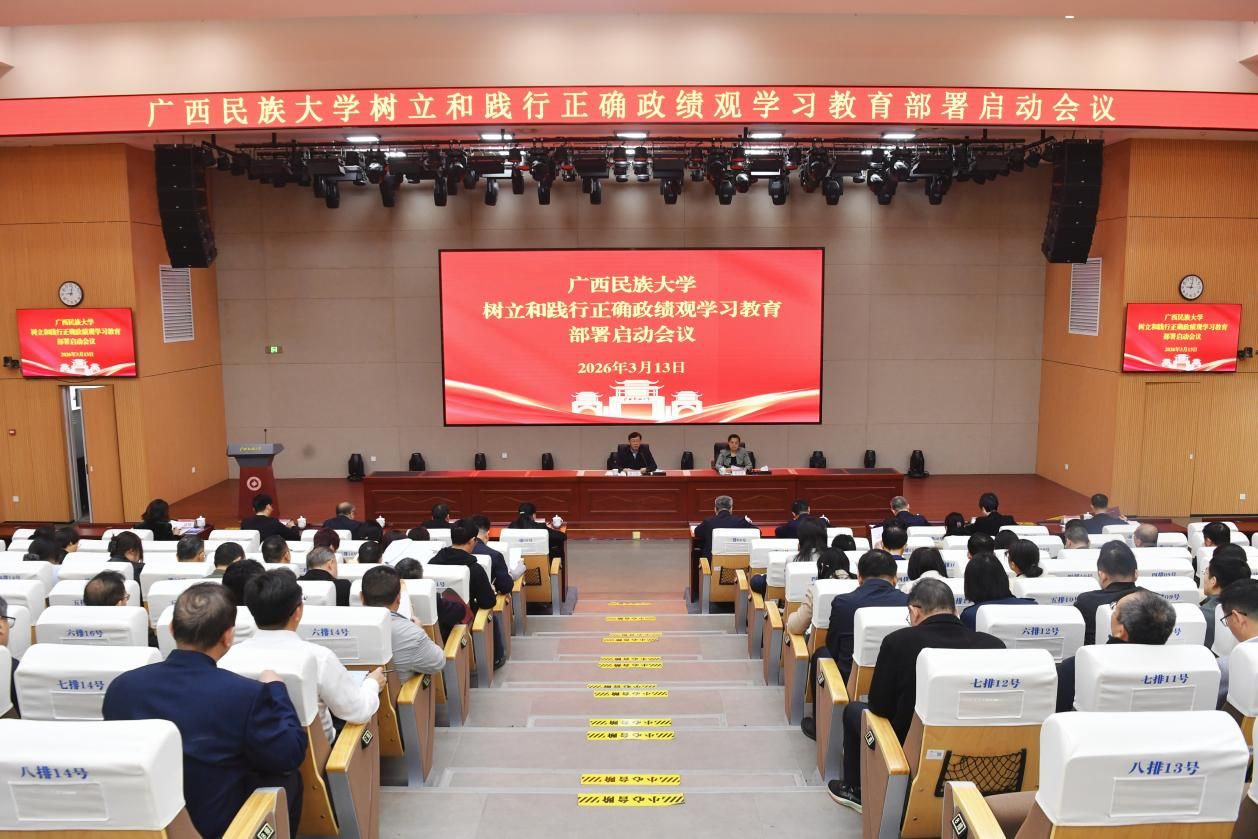 【大学生通讯社报道】3月13日上午,广西民族大学党委召开会议,学习贯彻习近平总书记关于树立和践行正确政绩观学习教育的重要讲话和重要指示精神,传达学习党中央、自治区党委关于学习教育的有关精神和要求,在全校部署启动树立和践行正确政绩观学习教育。学校党委书记唐平秋作部署启动讲话,党委副书记、校长韦仕珍主持会议,校领导陈铭彬、韦雪芳、邓国彬、蔡高根、吕俊彪、姜明国、周立亚出席会议。