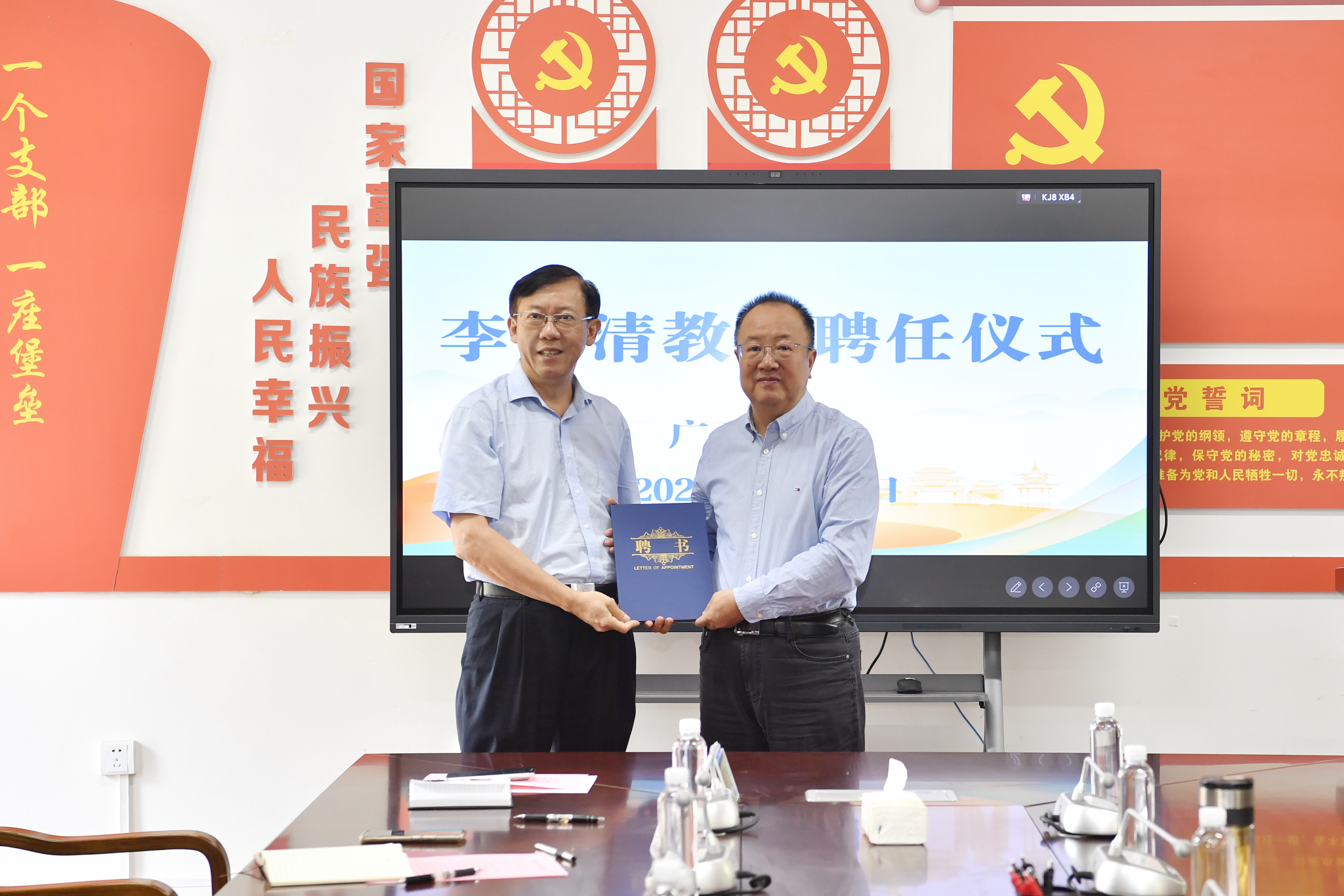会上,唐平秋为李俊清教授颁发广西民族大学相思湖讲席教授聘书。