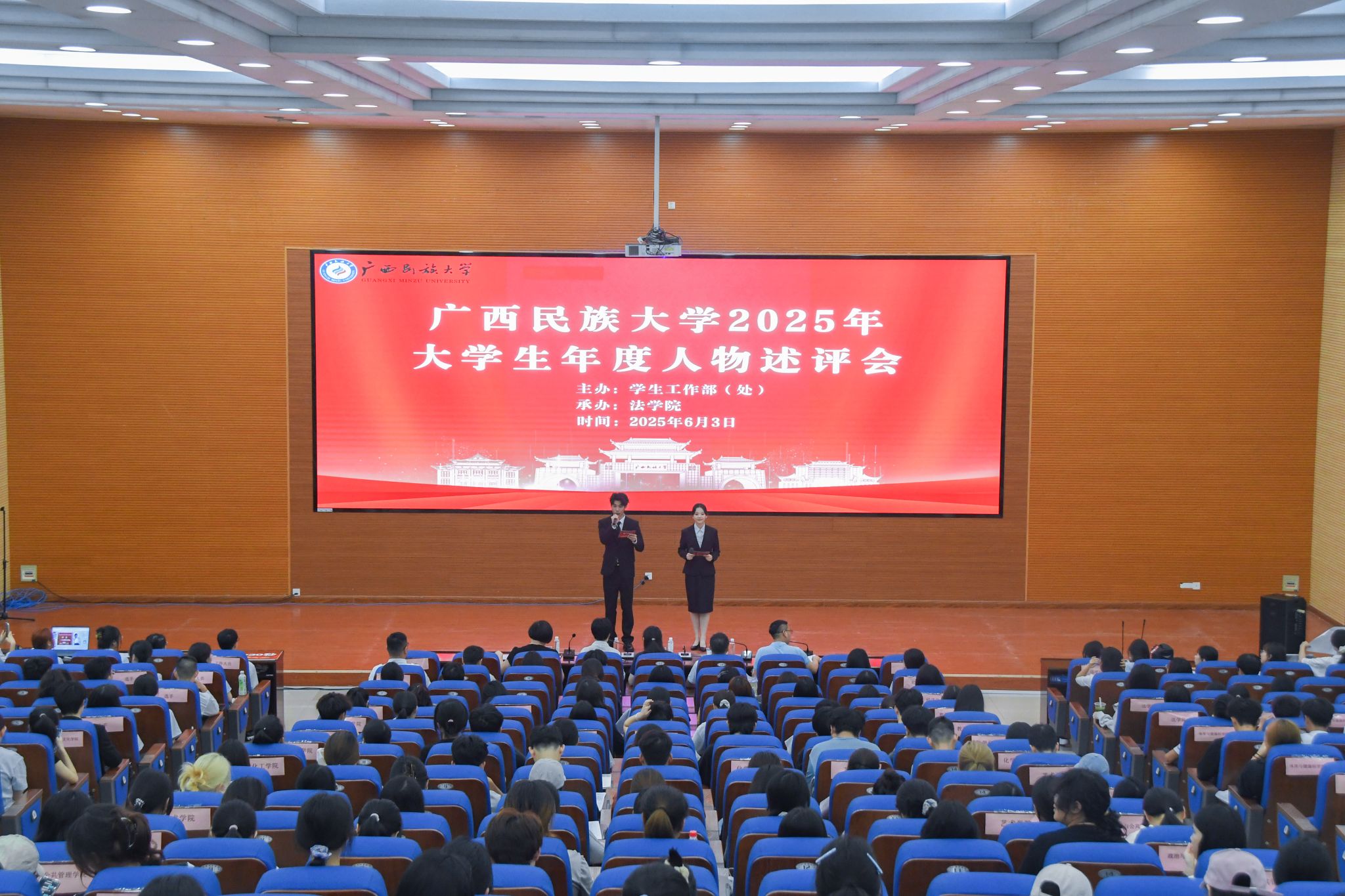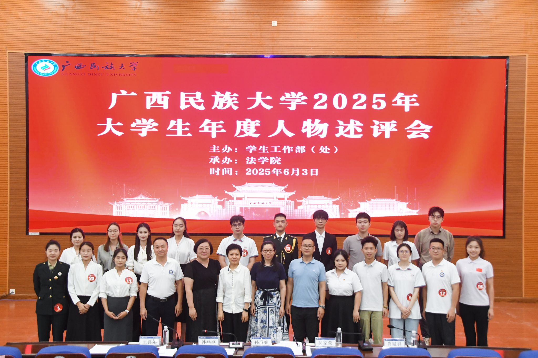 【大学生通讯社报道】6月3日下午,广西民族大学在思源湖校区明德楼101报告厅举行2025年大学生年度人物述评会。由校党委宣传部、学生工作部(处)、校团委、教务处、招生就业处等部门负责同志组成的评审委员,20名年度人物参评学生,部分学生代表参加述评会。
