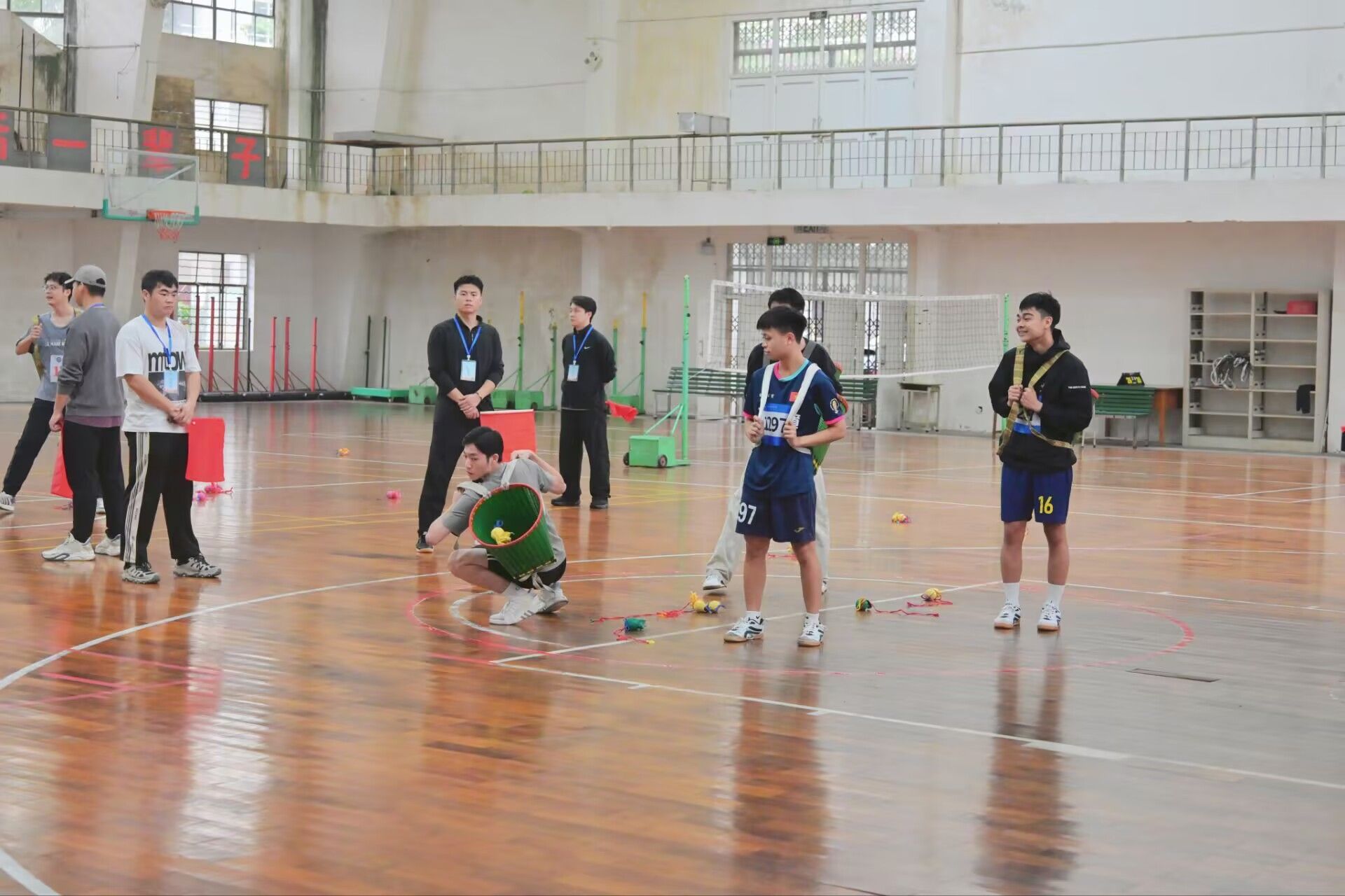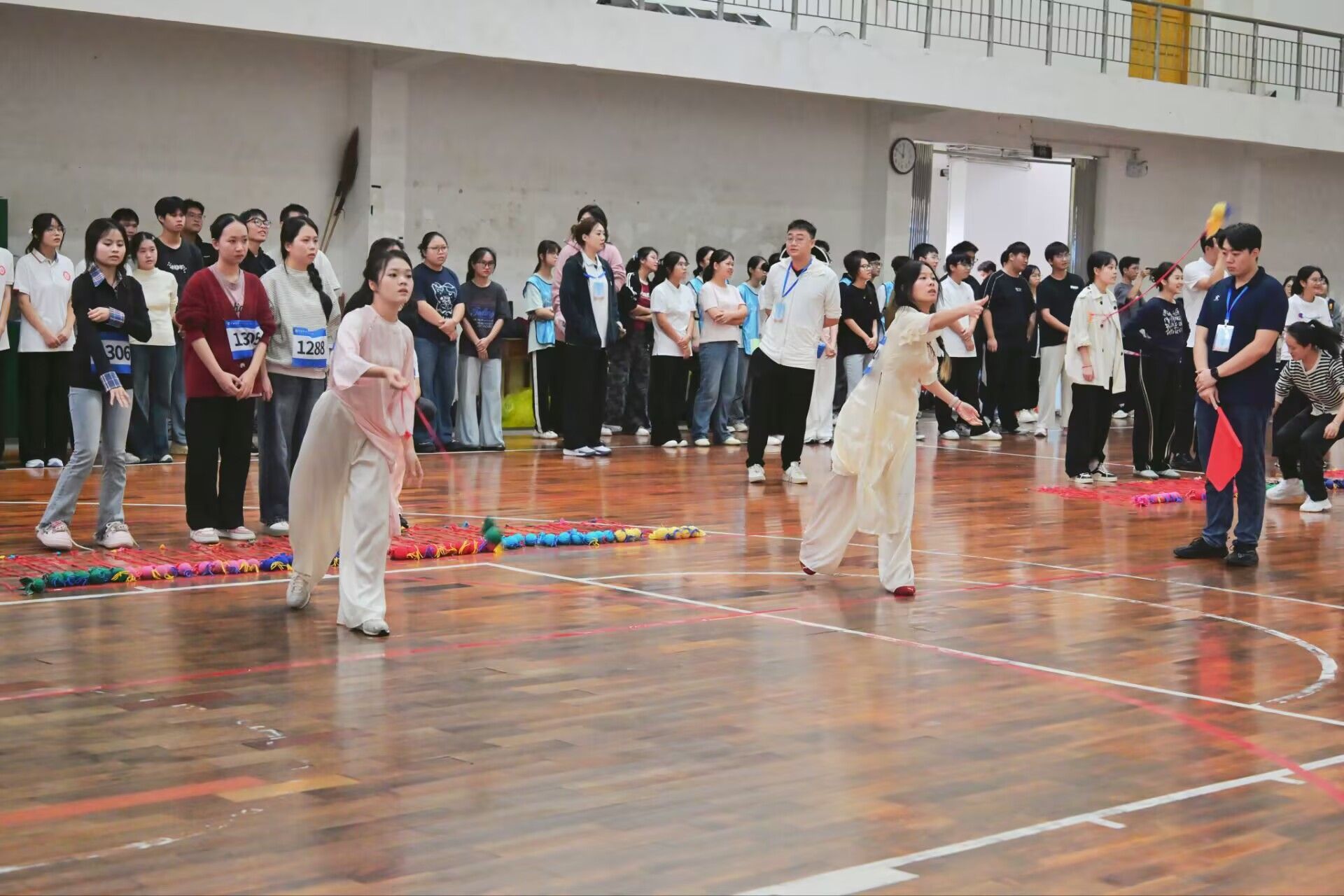 “预备,开始!”裁判一声令下,文学院2025级汉语言文学1班的李明展迅速俯身拾起绣球,深吸一口气,在看准队友的位置后奋力将手里的绣球抛了过去。
