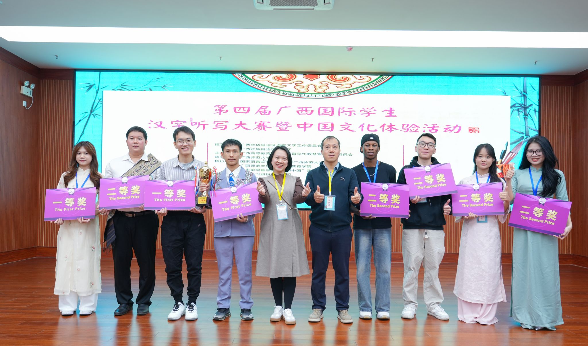 本次比赛分为个人赛和团体赛,共吸引了广西区内37所高校的257名外国留学生参赛,选手来自法国、科摩罗、老挝、马来西亚、美国、泰国、坦桑尼亚、越南等国家。学校共派出8名留学生参加比赛,经过两天的激烈角逐,个人赛中占锦杰、阮如玉、李家全获得中级组一等奖,坤赛获得高级组二等奖,阮晋禄获得中级组二等奖,约翰、冯氏薇、武锦秀获得初级组二等奖。