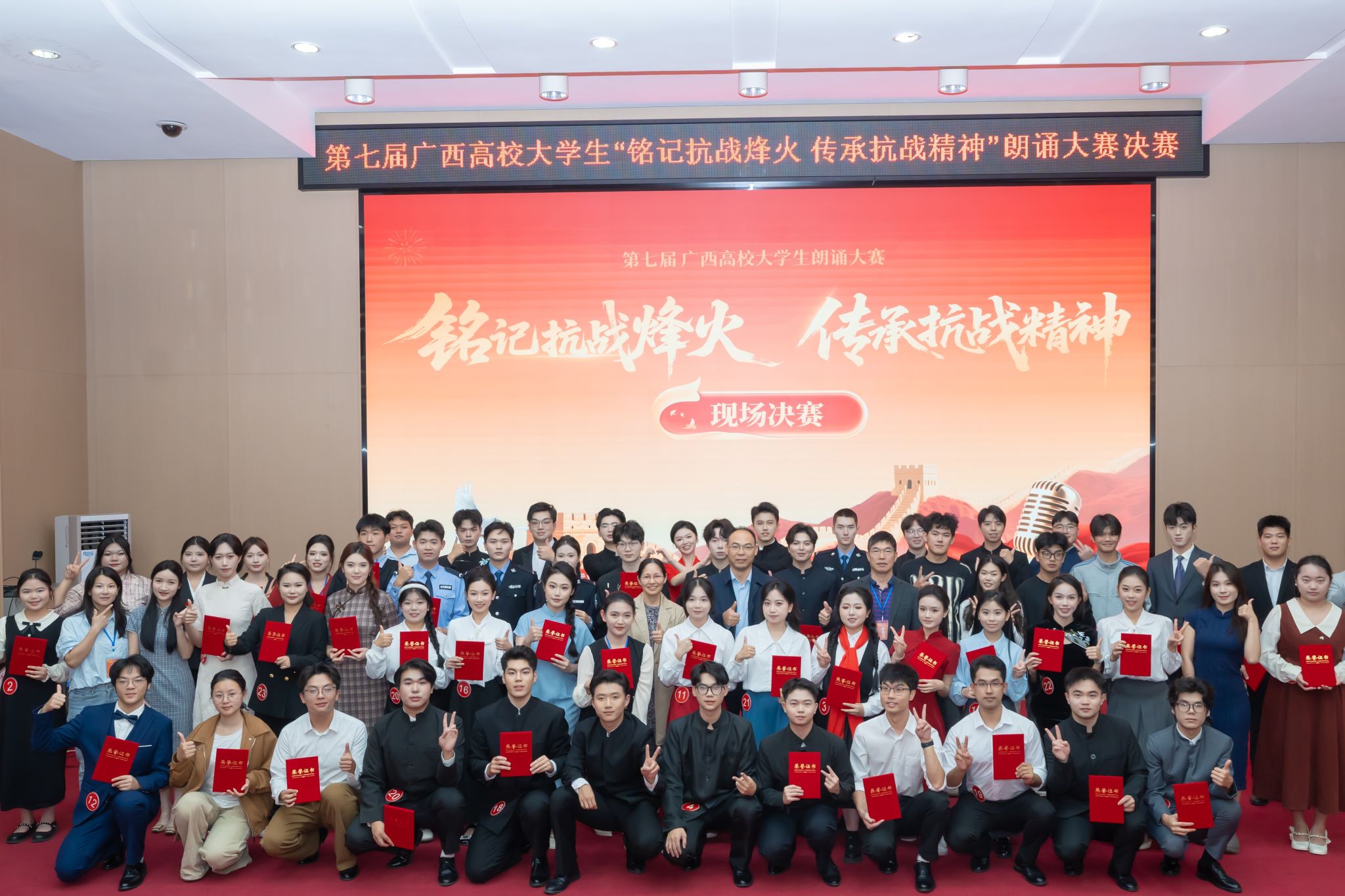 据悉,本次大赛由广西高等教育学会图书馆专业委员会等单位联合主办,以“铭记抗战烽火·传承抗战精神”为主题,旨在引导青年大学生铭记抗战历史、缅怀革命先烈、传承红色基因,激发新时代青年的爱国情怀与责任担当。大赛自启动以来,得到全区各高校的积极响应,最终有37所高校的48件佳作成功入围现场决赛。(初审:李再莲 编辑:韦丽娜 实习编辑:樊甲利 复审:韦利坤 终审:孙寿媚)