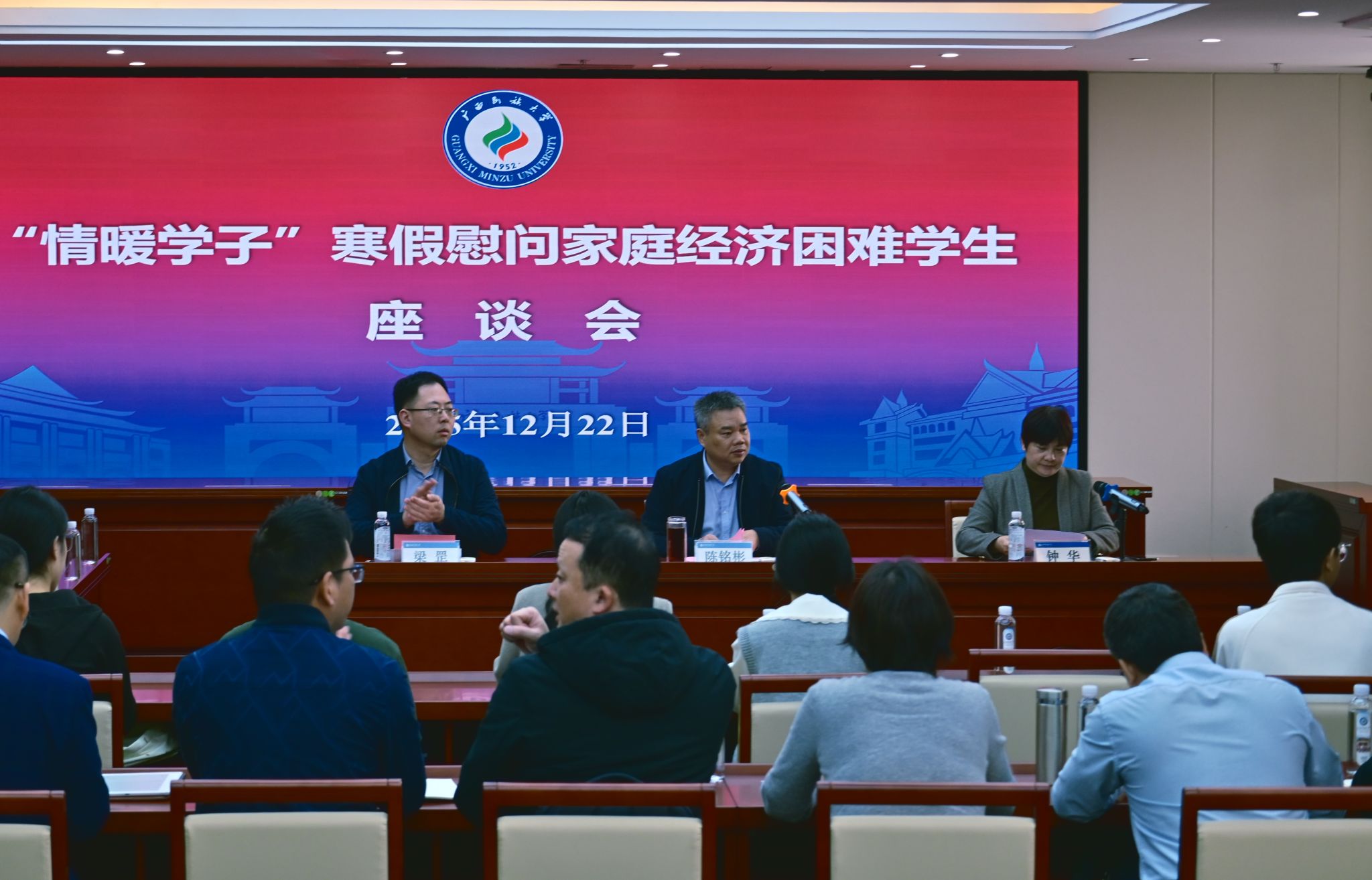 【大学生通讯社报道】12月22日,广西民族大学在武鸣校区信息楼607会议室召开“情暖学子”寒假慰问家庭经济困难学生座谈会,学校党委副书记陈铭彬出席,学生工作部(处)、校团委、武鸣校区各学院负责人及获助学生代表参加会议。
