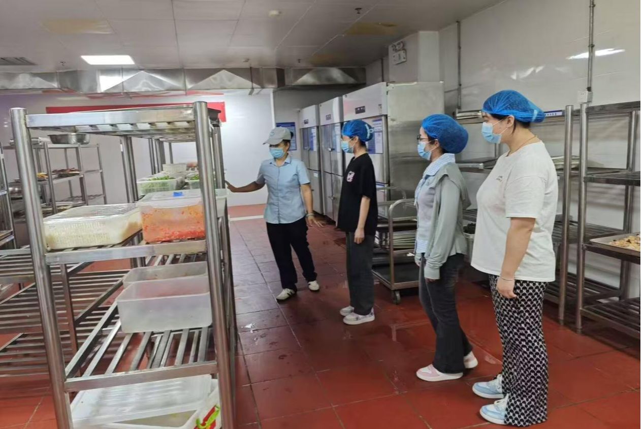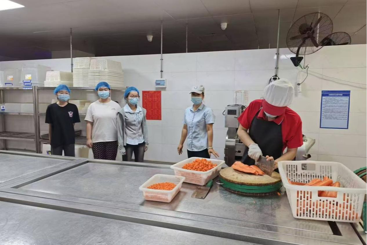 活动分多组进行,学生代表在工作人员引导下,依次参观原材料验收区、蔬菜初步加工区、肉类切配加工区、熟食加工区、烹饪区、白案间、蒸饭间、饭菜售卖区及洗碗间等关键区域。食堂负责人详细讲解食材采购、验收、储存、加工及餐具清洗消毒等流程,现场展示食品留样与每日清洁台账。
