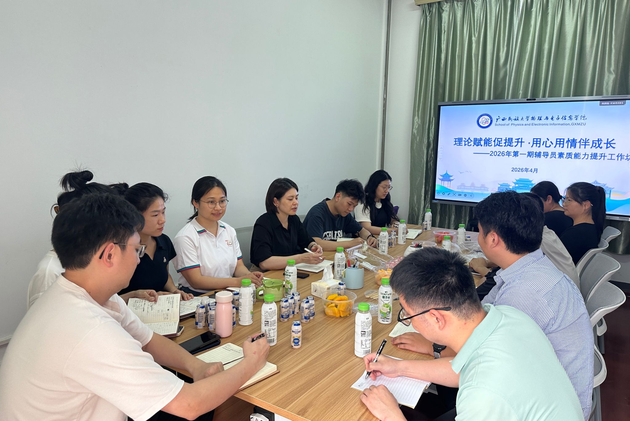 4月7日,广西民族大学物理与电子信息学院在博识楼224会议室举行2026年第一期辅导员素质能力提升工作坊。本次工作坊由学院党委副书记玉琳主持,学院全体辅导员参加。